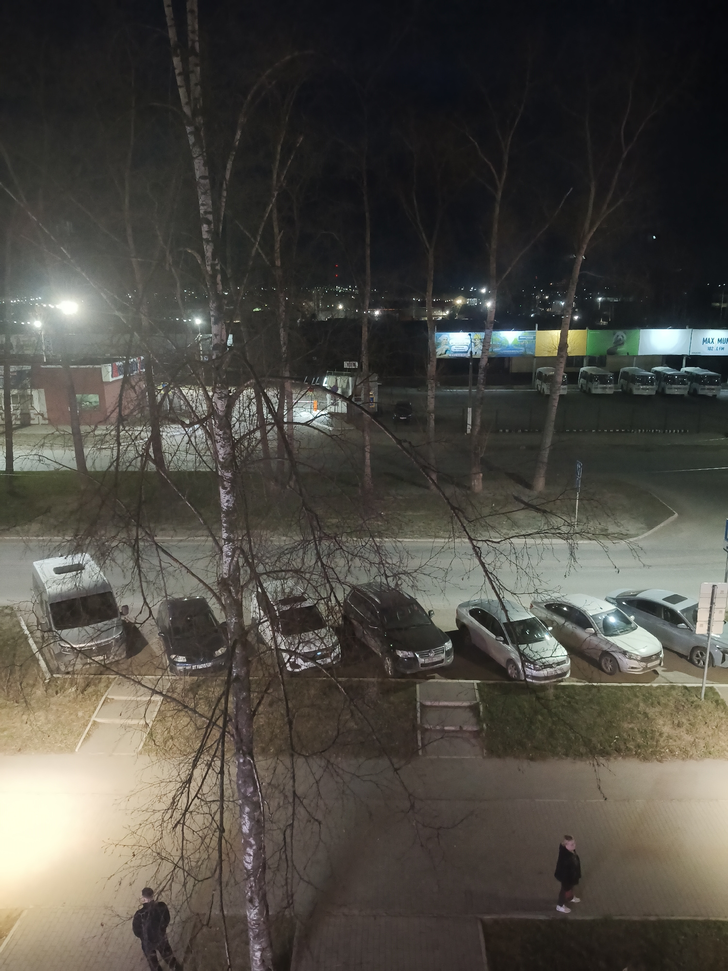 The image shows a nighttime view from an elevated position, likely a window. The scene overlooks a street in Chaikovsky, Russia with parked cars and trees. Six parked cars are visible, predominantly s…read more