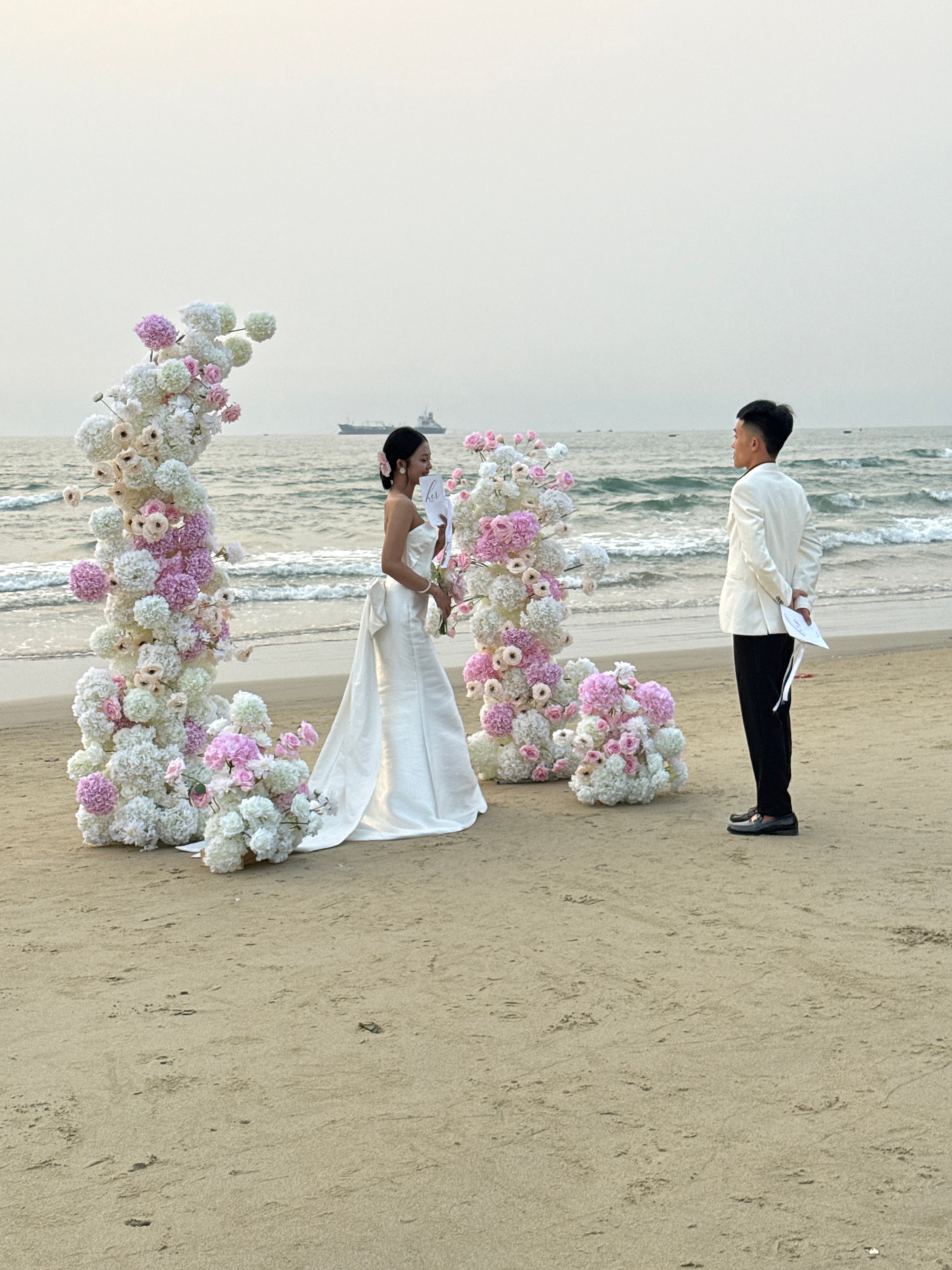 A wedding ceremony is taking place on a beach. A man, dressed in black pants, a white jacket, and black shoes, holds papers in his hands. A woman, wearing a white wedding dress, stands in front of him…read more