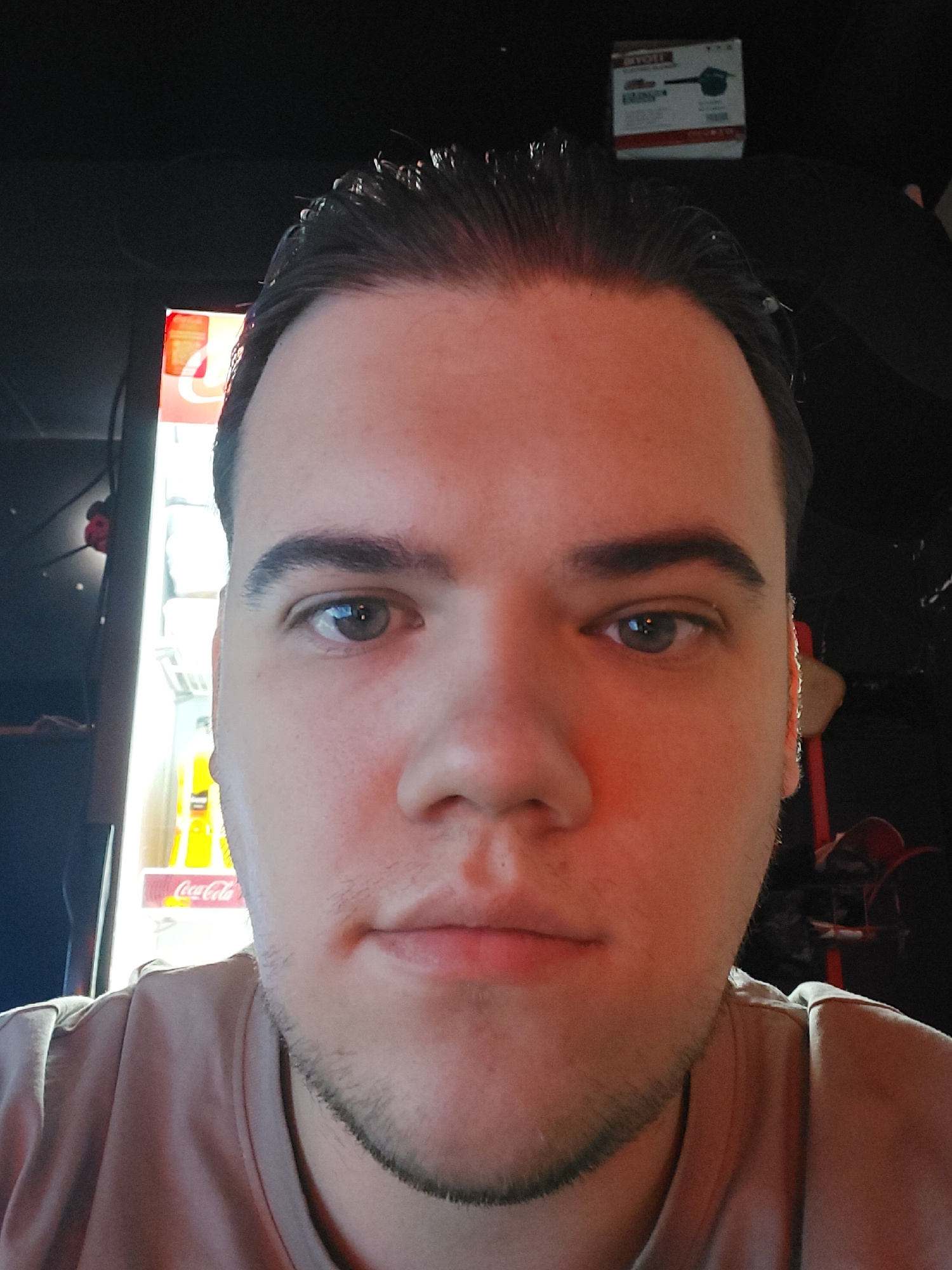 A close-up selfie of a person with light skin, dark hair slicked back, and short facial hair. The person is wearing a tan shirt. Behind the person is a Coca-Cola branded vending machine. To the rightβ¦read more