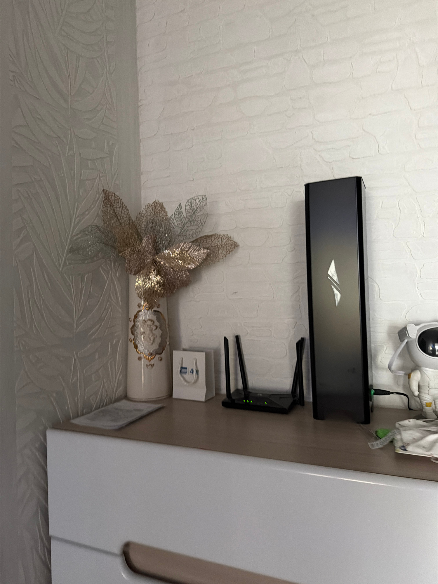 The image depicts an interior wall with several objects mounted or placed against it. The wall is painted with a textured, off-white pattern. At the top is a black box with a silver logo, mounted hori…read more