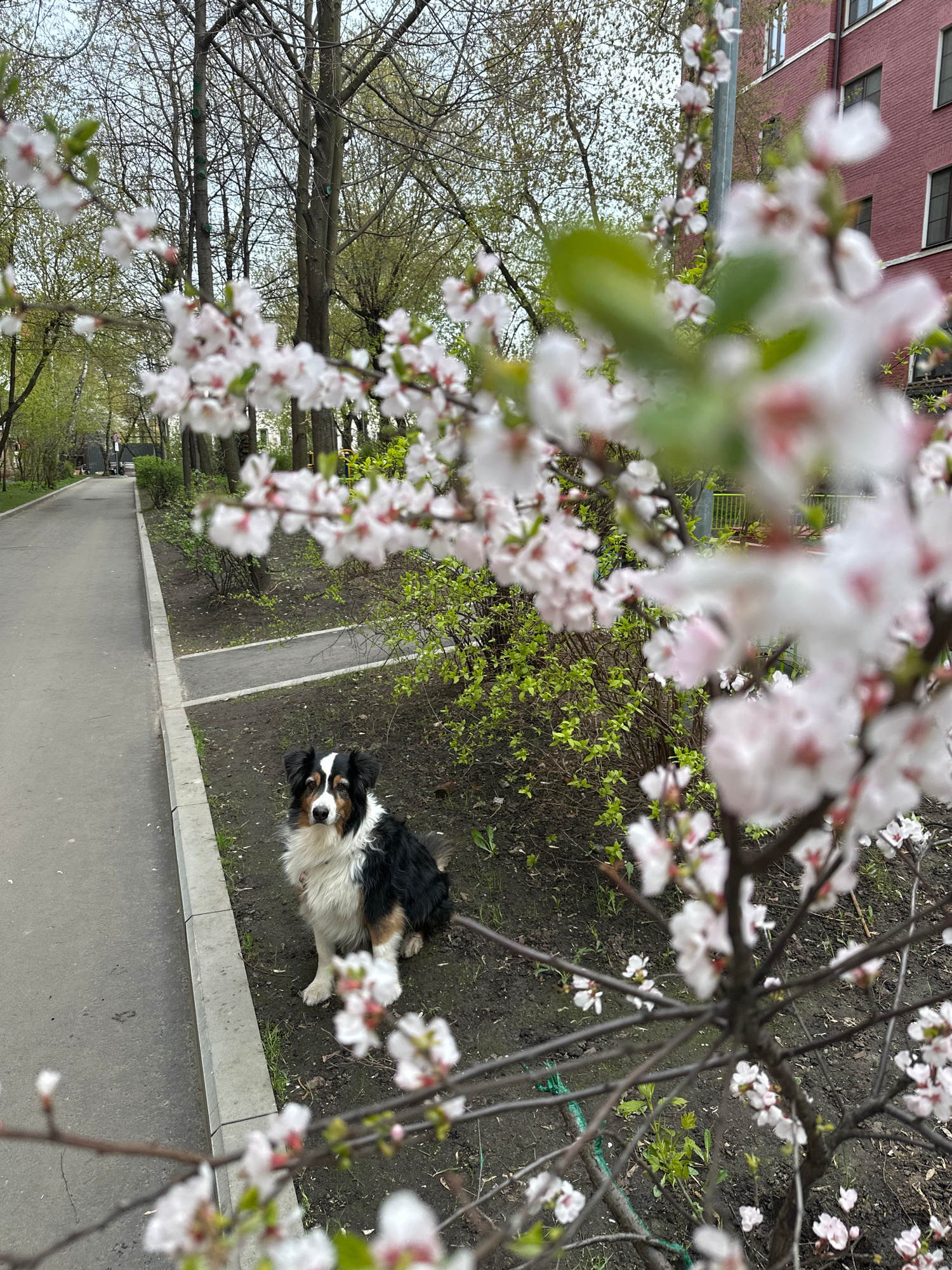 An outdoor, eye-level photograph, rotated 90 degrees clockwise, captures a springtime scene in what appears to be Moscow, Russia. The primary subject is a small to medium-sized tricolor dog, possibly…read more