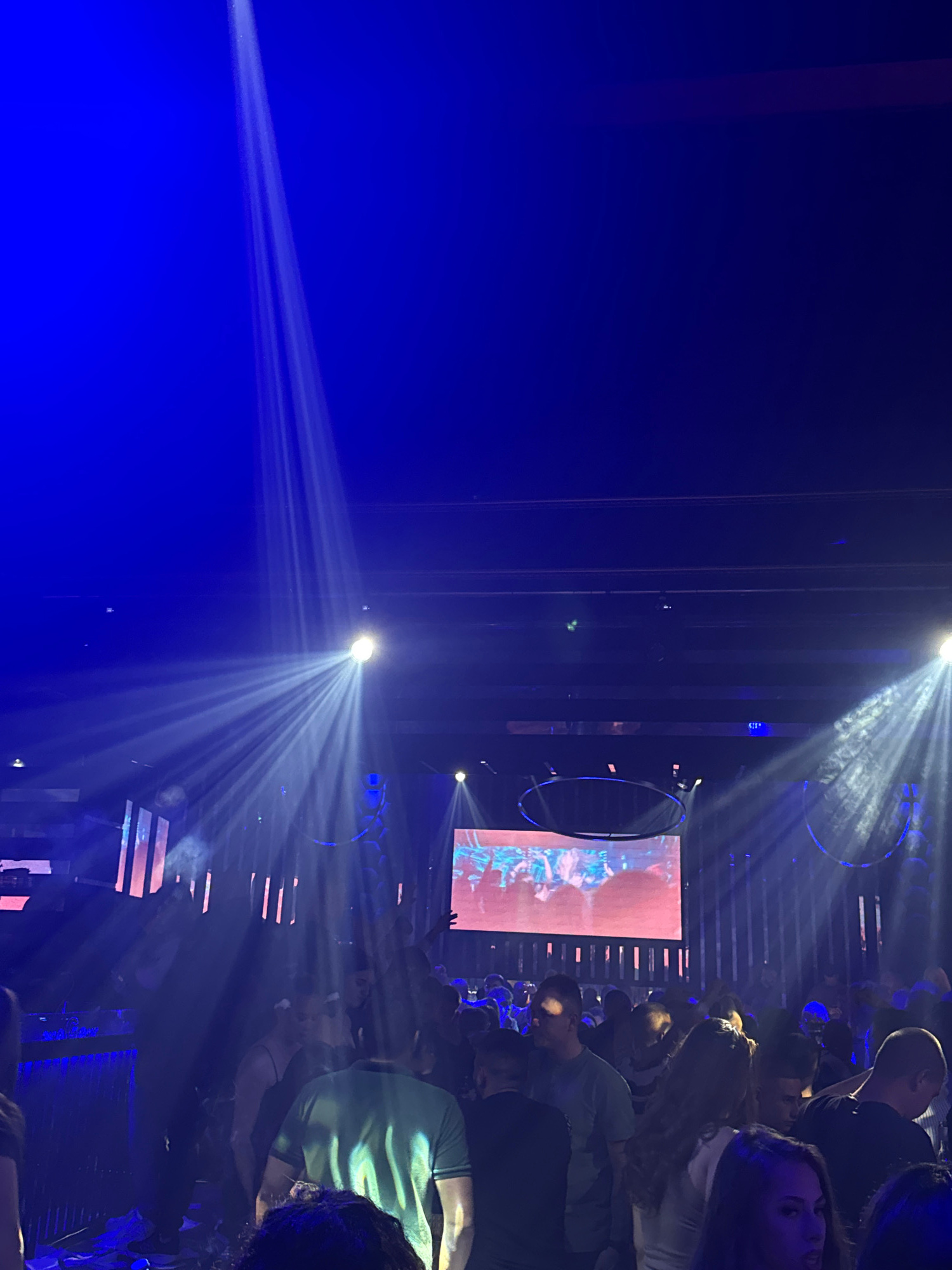 A dark interior space, likely a concert venue in Gotse Delchev, Bulgaria, is illuminated by stage lights with beams directed through a crowd of people. A large screen displays graphics, possibly partβ¦read more