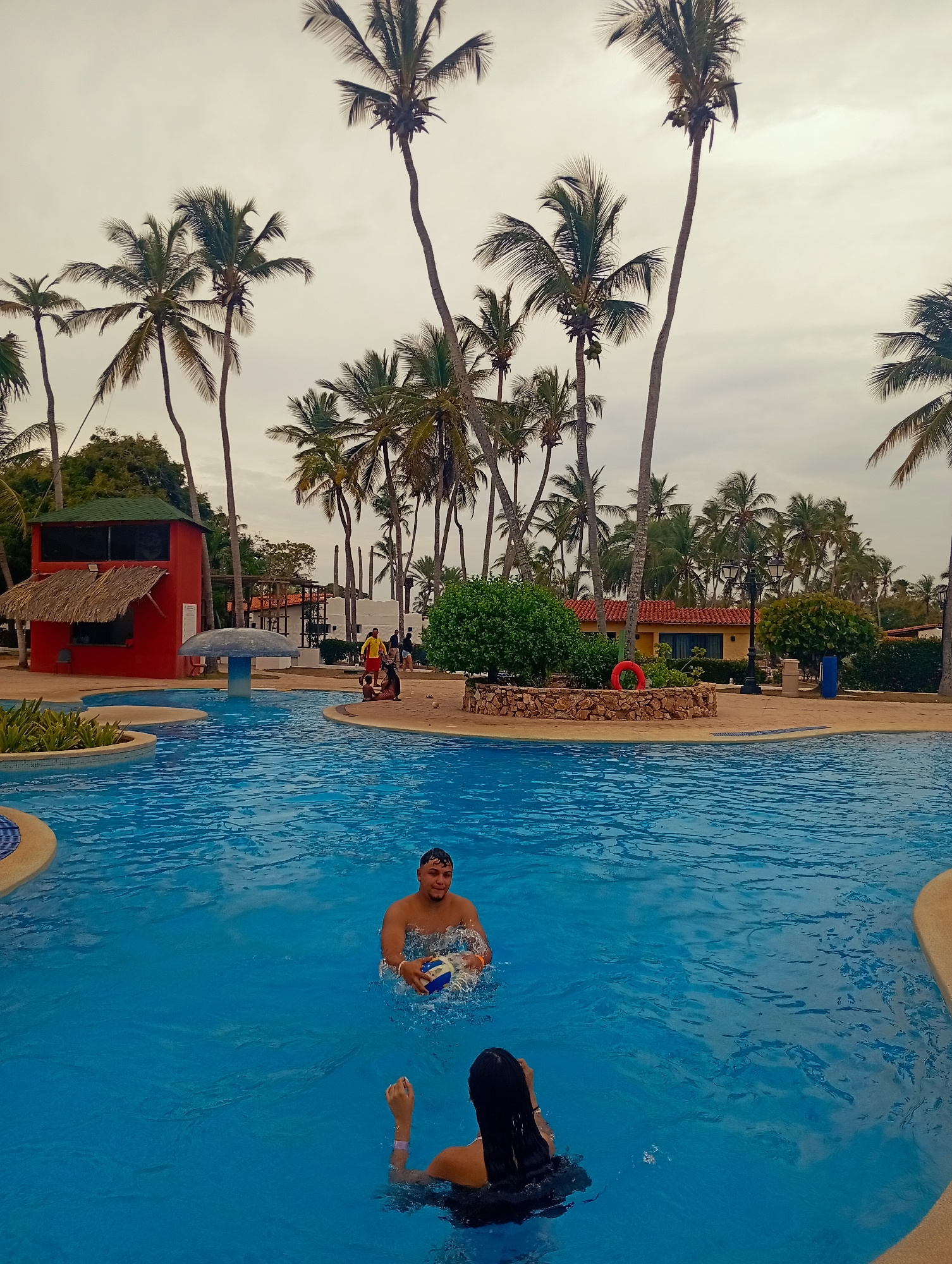 The image depicts a swimming pool in Playa El Agua, Venezuela. Two individuals are in the pool: one male with a ball and a female facing away from the camera. The pool is surrounded by palm trees, strβ¦read more