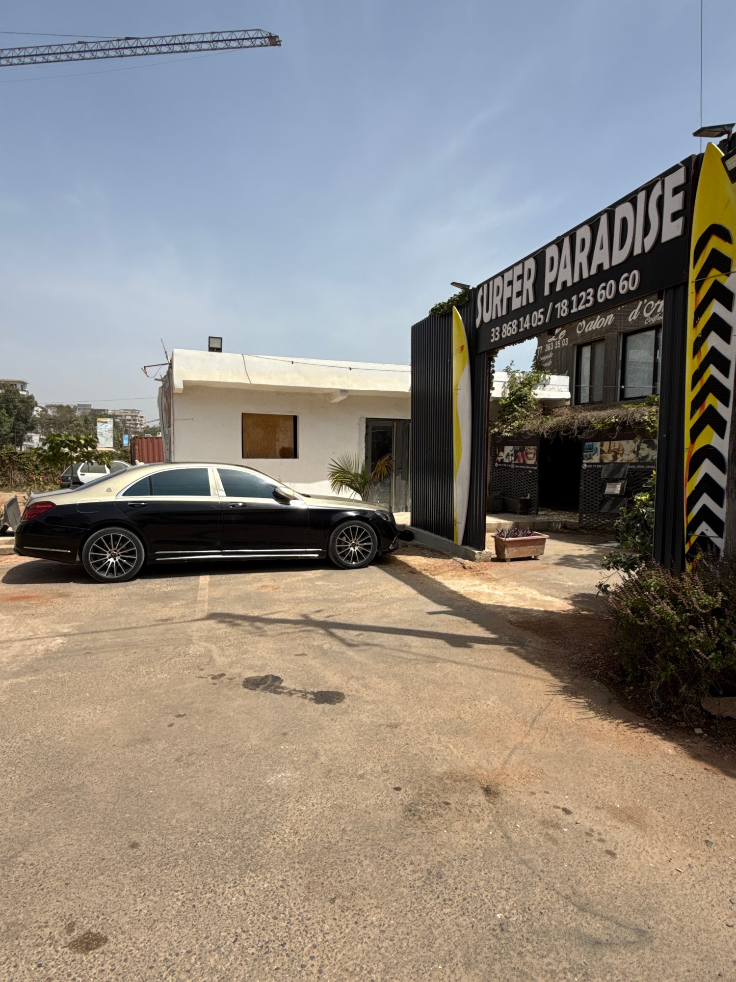 The image shows a black and white Mercedes-Maybach parked on a paved street in what appears to be Dakar, Senegal. A sign for "Surfer Paradise" with a Senegalese telephone number (33 868 14 05 / 78 123…read more