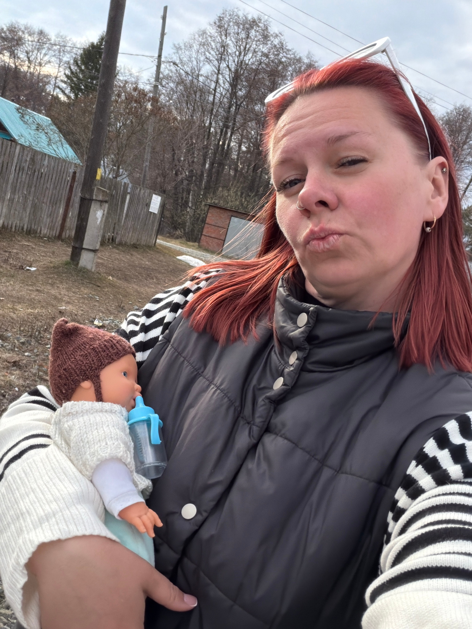 The image, taken in Chaikovsky, Russia, features a woman holding a baby doll outdoors. The woman, who has reddish-brown hair and fair skin, is looking towards the viewer with a slight pout. She wearsβ¦read more