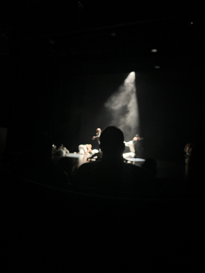 The image depicts a dark interior scene of a performance venue in Vancouver, Canada. The perspective is from an audience member's seat, looking towards a stage. In the immediate foreground, the blurre…read more