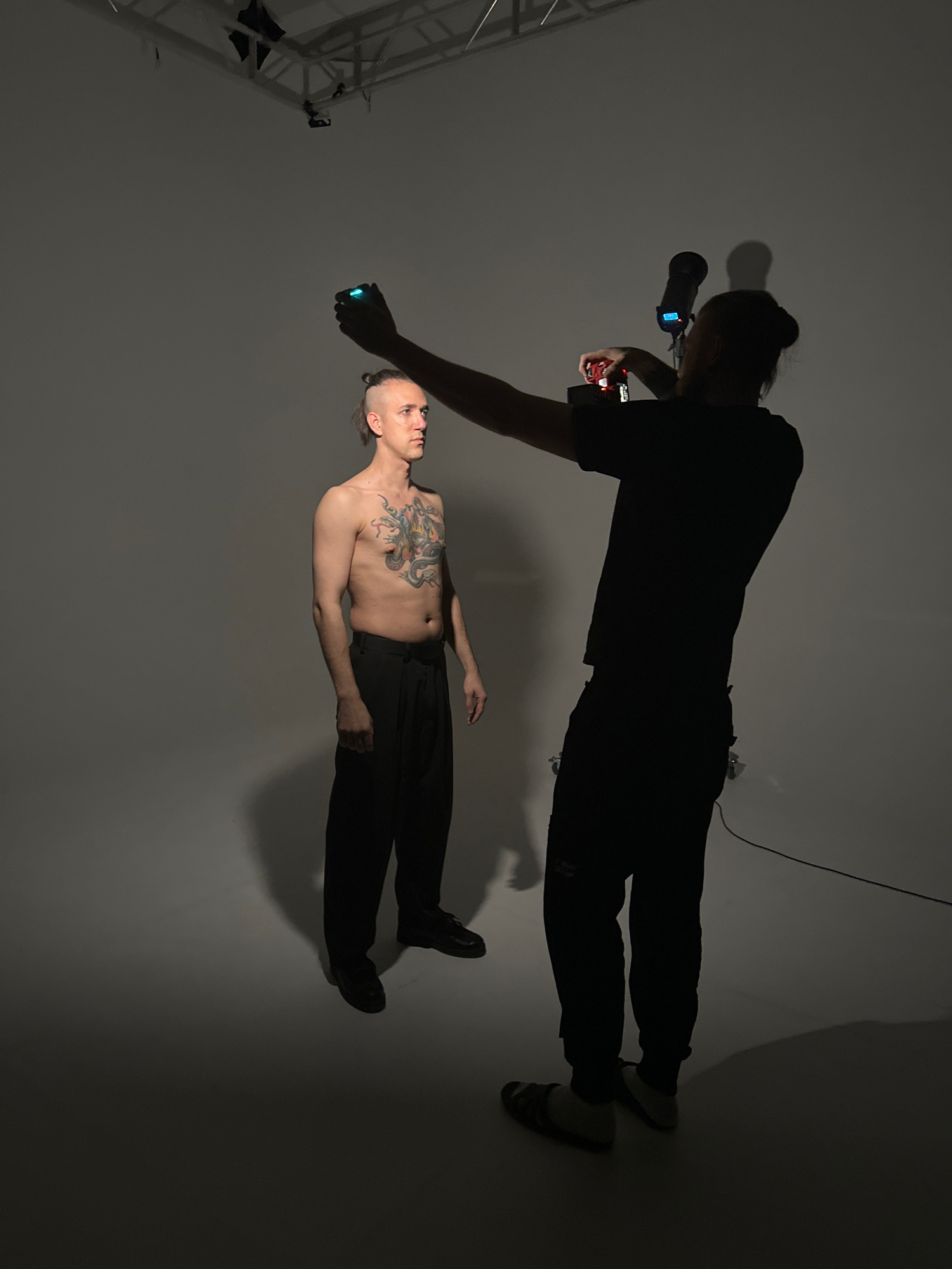 A male individual with a prominent chest tattoo and a top-knot hairstyle poses shirtless in a professional photo studio located in Saratov, Russia. He wears dark trousers and dark dress shoes, standin…read more