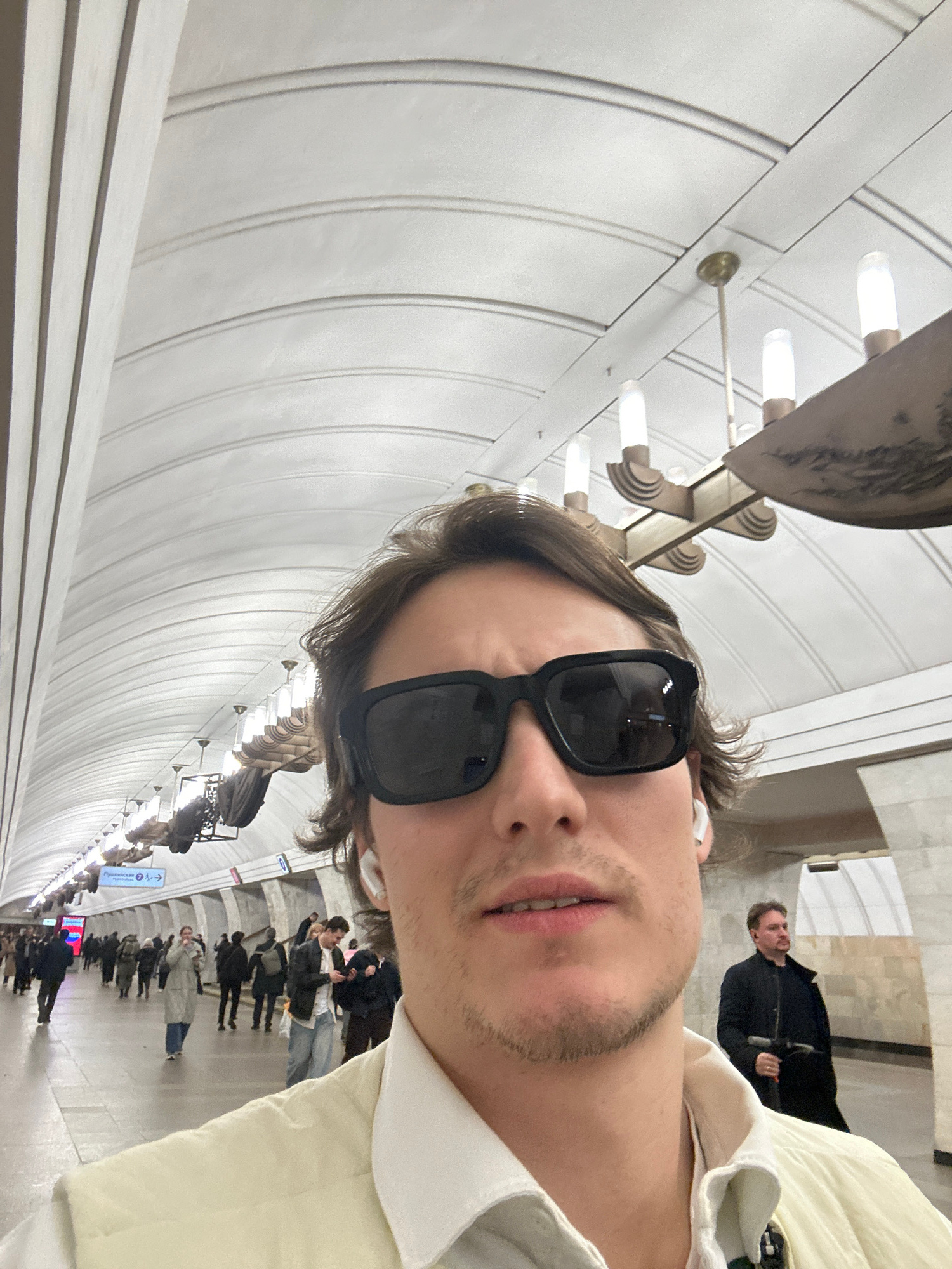 The image depicts a person wearing sunglasses, potentially taking a selfie. The background reveals an interior view of the Moscow Metro in Russia. Specifically, the curved, white tiled walls with deco…read more