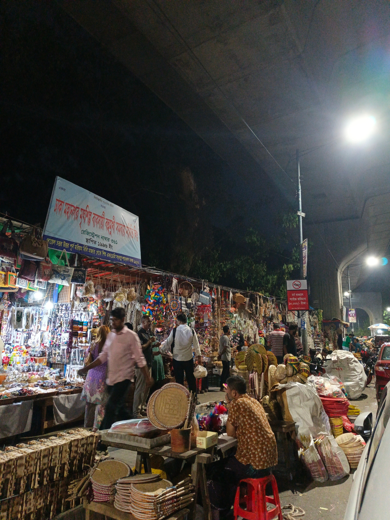 The image shows an outdoor marketplace in Dhaka, Bangladesh at night. Vendors display various goods, including jewelry, bags, and woven crafts, under a bridge. Several people are browsing or walking t…read more