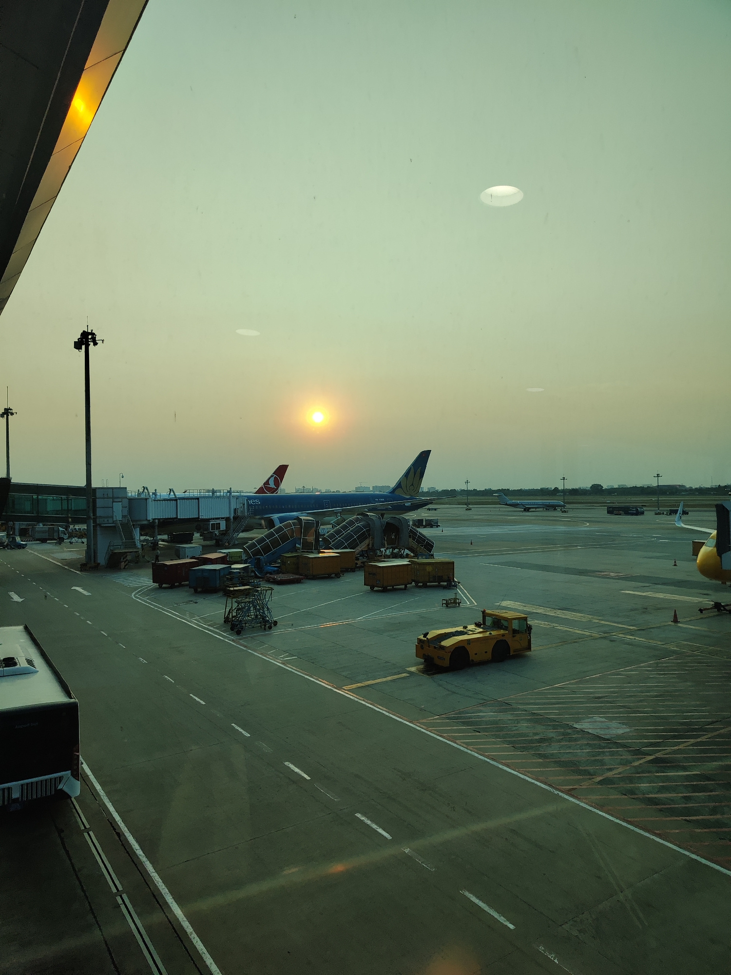 The image depicts an airport scene at sunset in Thuận An, Vietnam. A large window, likely from inside the terminal, offers a view of the tarmac. A Vietnam Airlines aircraft is connected to a jet bridg…read more