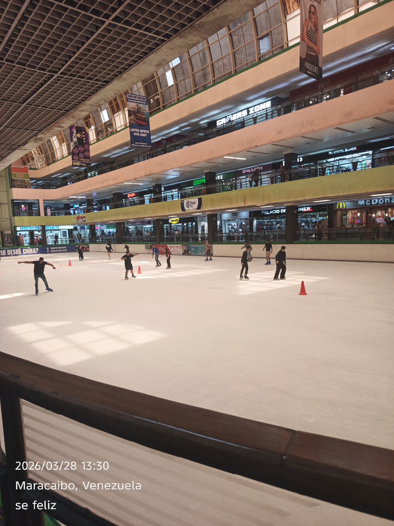 The image shows an indoor ice skating rink inside a multi-story shopping mall in Maracaibo, Venezuela. Several people are ice skating on the rink, with orange cones marking the space. A wooden railing…read more