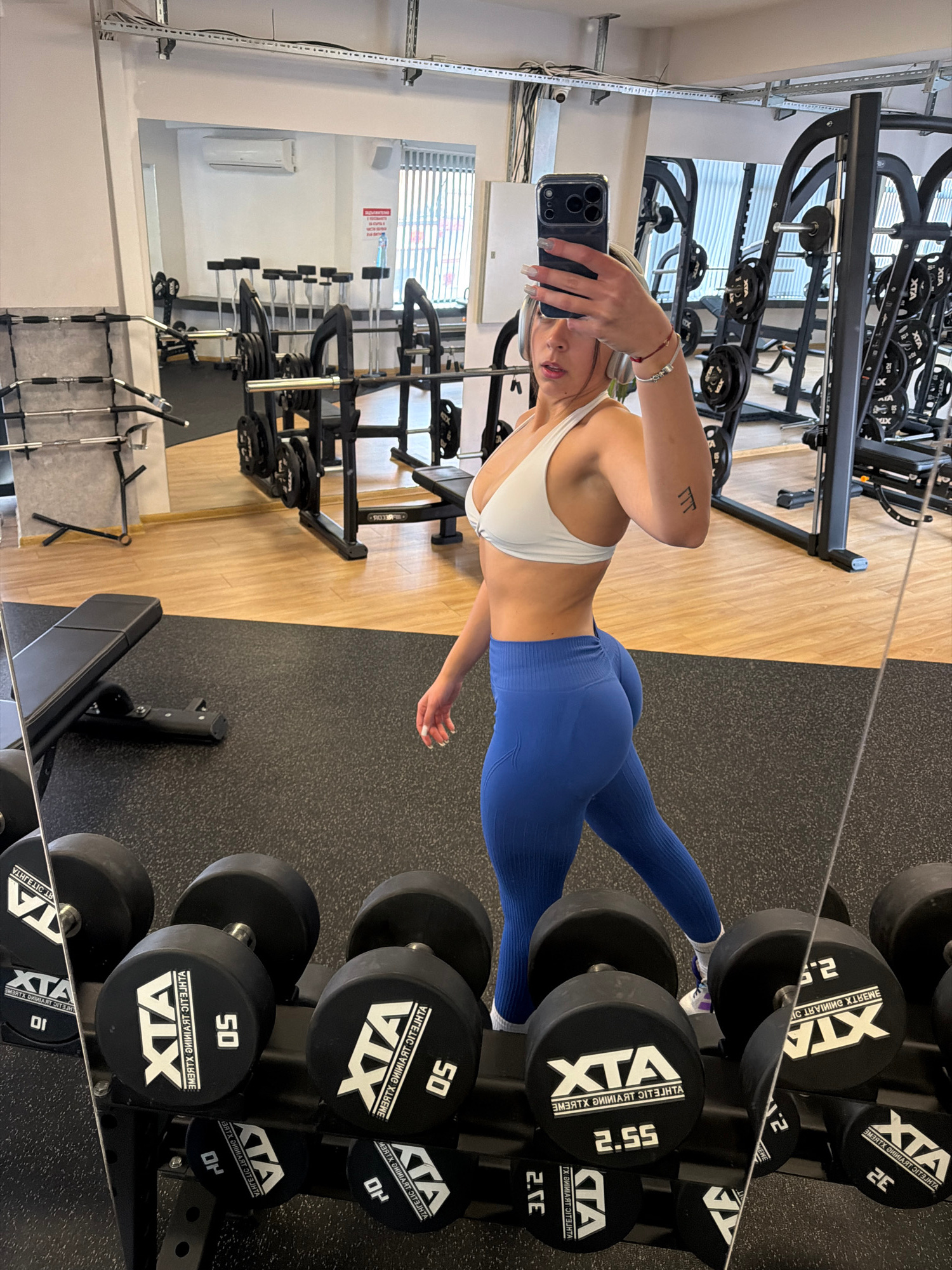 The image is a selfie taken by a young woman in a gym, likely through a mirror. She is wearing a white sports bra and blue leggings. The gym is well-equipped with weightlifting equipment, including du…read more