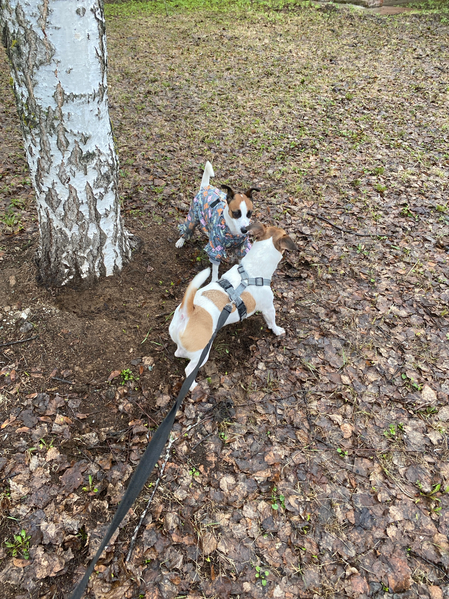 Two Jack Russell Terriers are interacting outdoors on ground covered with brown leaves and sparse green vegetation. One dog is wearing a patterned coat, while the other has a harness and is attached t…read more