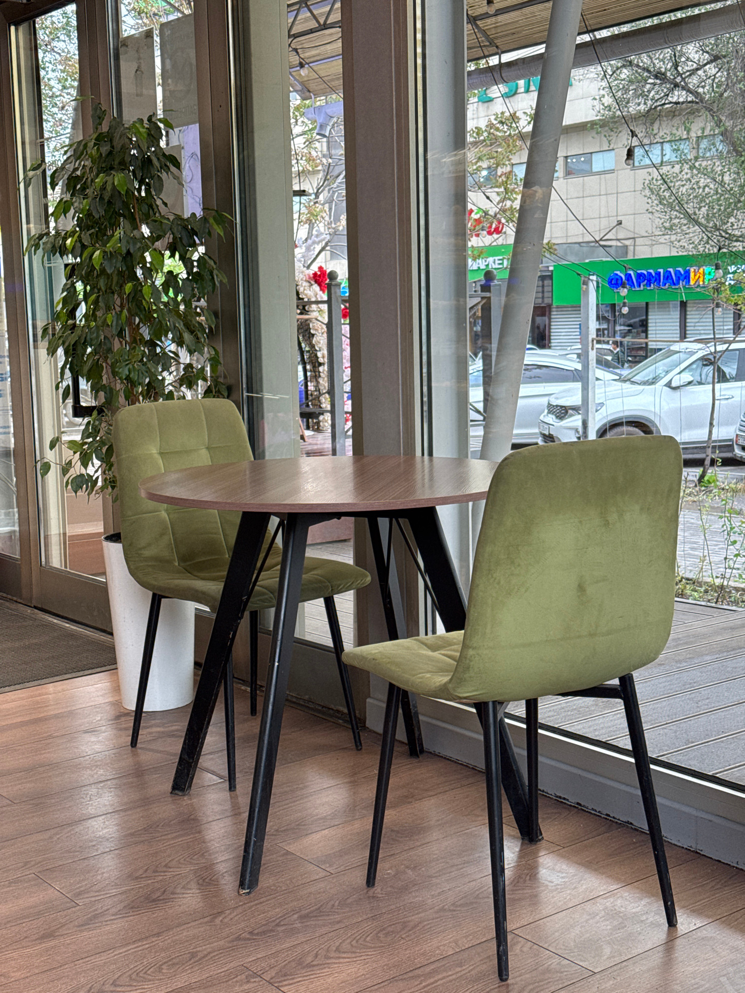 The image presents an interior view, likely from a cafe or restaurant, looking out through a large window onto an urban street in Bishkek City, Kyrgyzstan. In the foreground and mid-ground, within th…read more