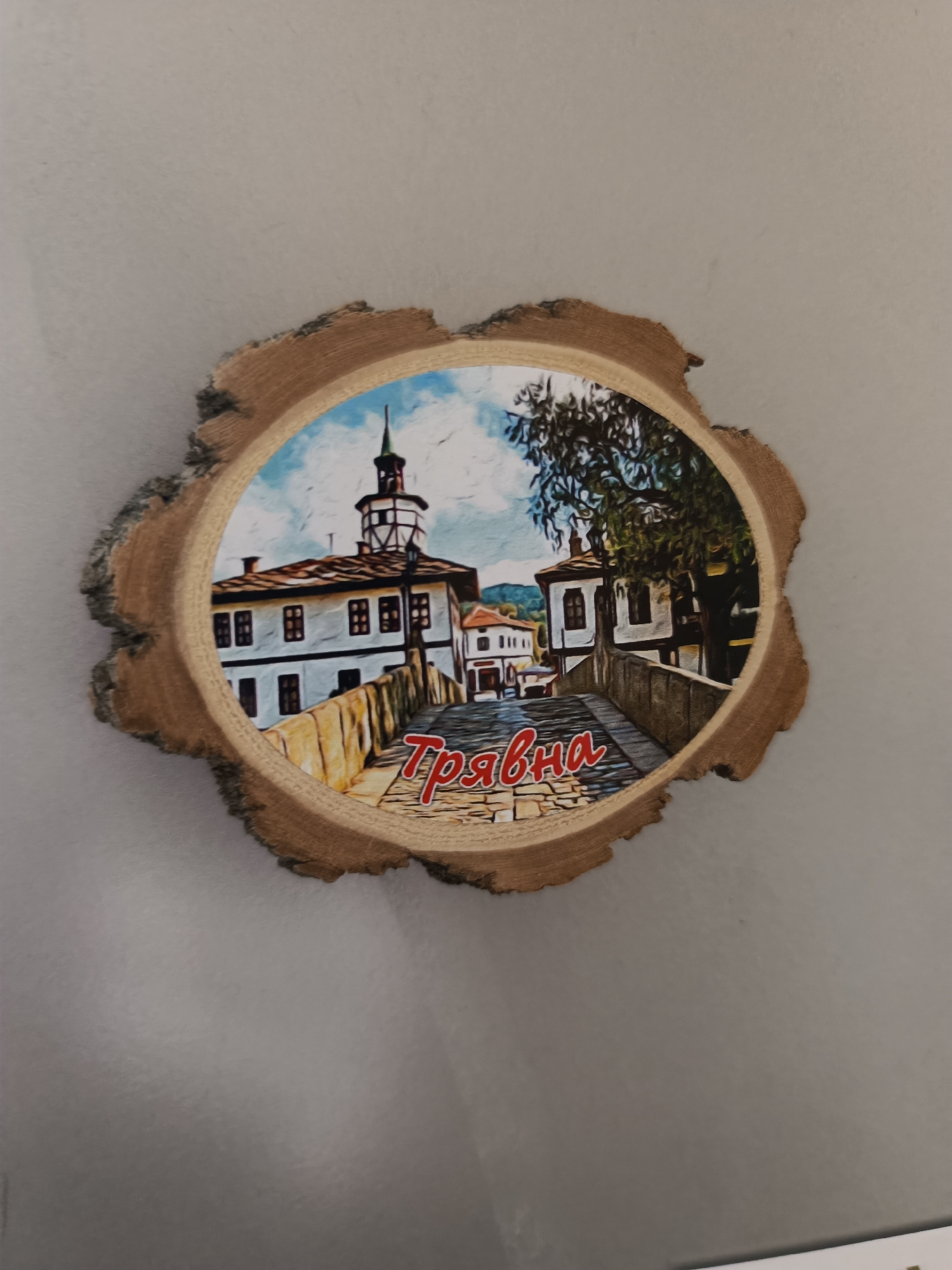The image shows a souvenir magnet depicting a scene from Tryavna, Bulgaria. The magnet is in the shape of a rough-cut wood slice, with the edges showing bark. The scene is of a bridge and buildings in…read more