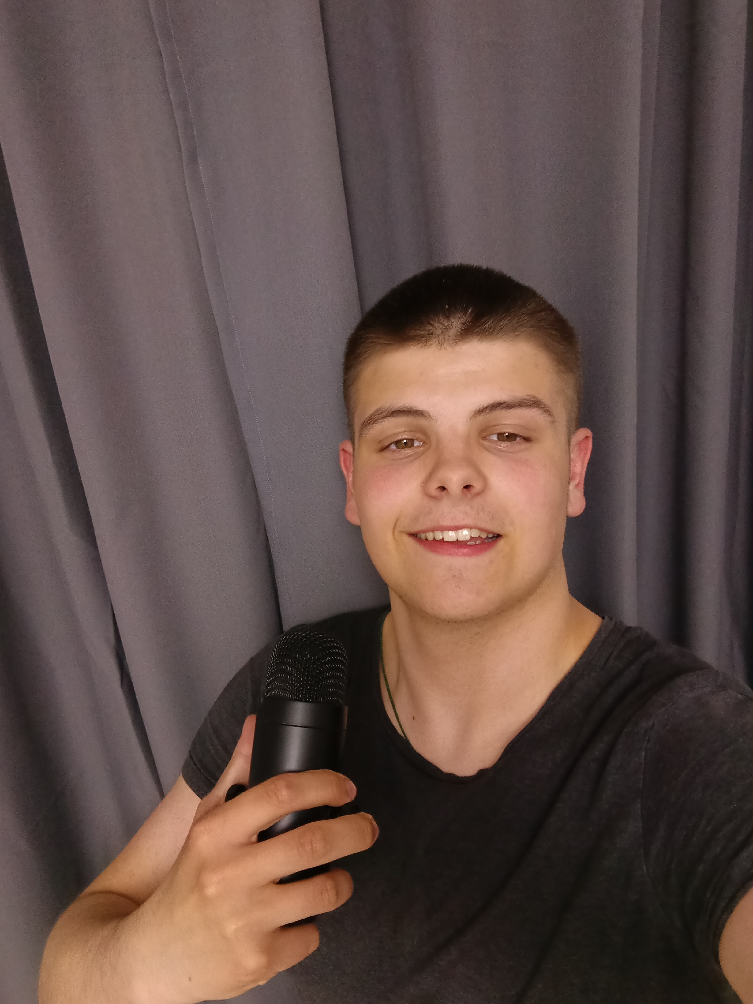 A young man with short brown hair and fair skin stands indoors, holding a black microphone in his right hand. He is wearing a dark gray t-shirt. Behind him is a gray curtain. There is no visual inform…read more