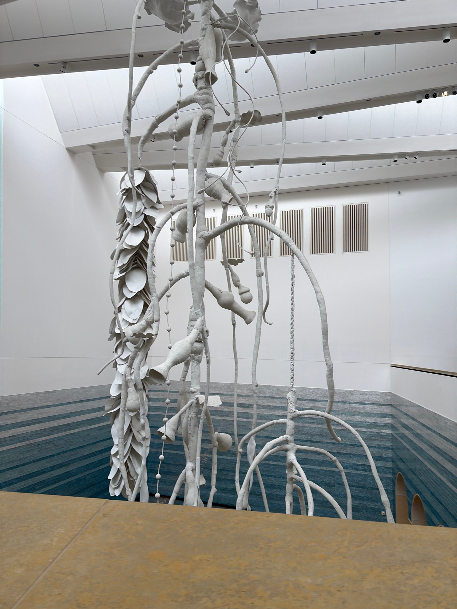 This image depicts a white art installation hanging in an indoor space. The installation features branch-like structures with various sculptural forms attached, resembling leaves, vessels, and abstrac…read more