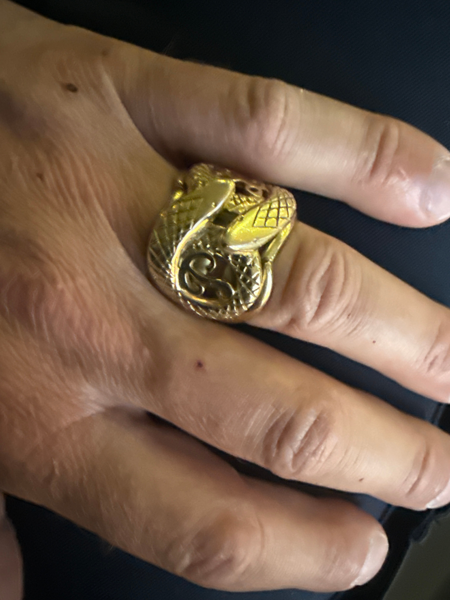 A close-up shot shows a hand with a golden ring on the ring finger. The ring appears to be designed with a snake motif and intricate detailing. The background is a dark, possibly navy blue surface. No…read more