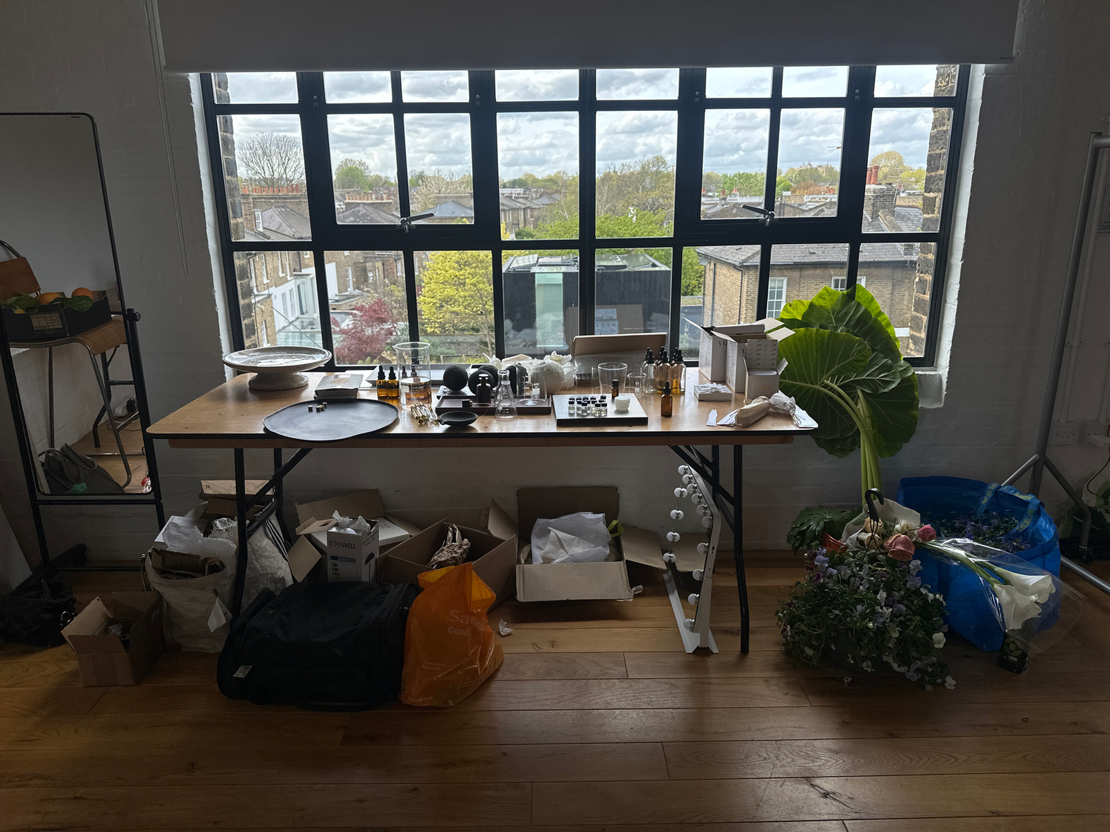 The image presents an indoor studio or workshop space, characterized by a large, multi-paned dark-framed window that overlooks an urban landscape. Through the window, various brick buildings, rooftops…read more