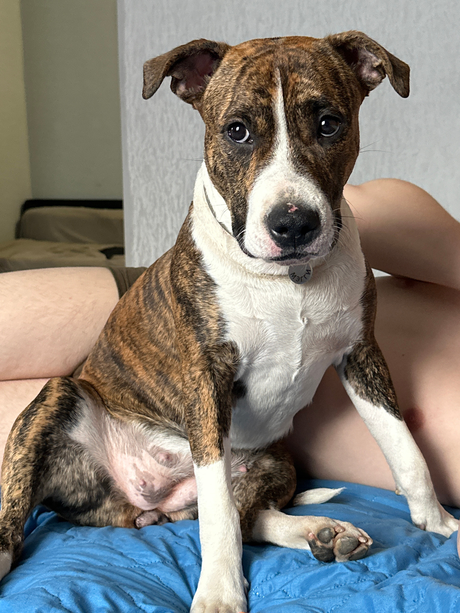 In an indoor setting in Trudovaya, Russia, a brindle-patterned dog with white markings on its chest and face is being held by a person. The dog, which appears to be lying comfortably, looks directly a…read more