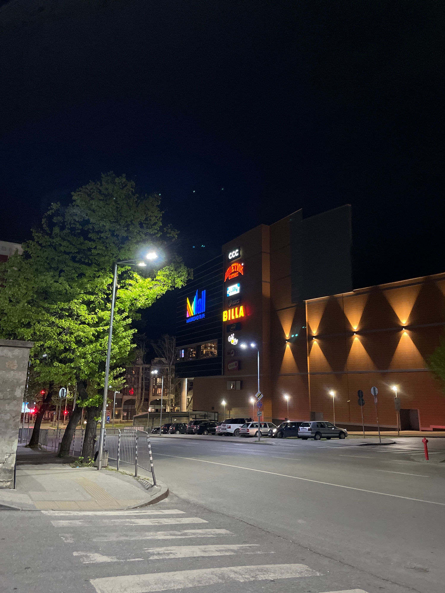Nighttime scene in Plovdiv, Bulgaria, featuring a multi-story building with illuminated storefronts including "CCC," "Deichmann Outlet," "Billa," and "Marriott." The building facade is decorated with…read more