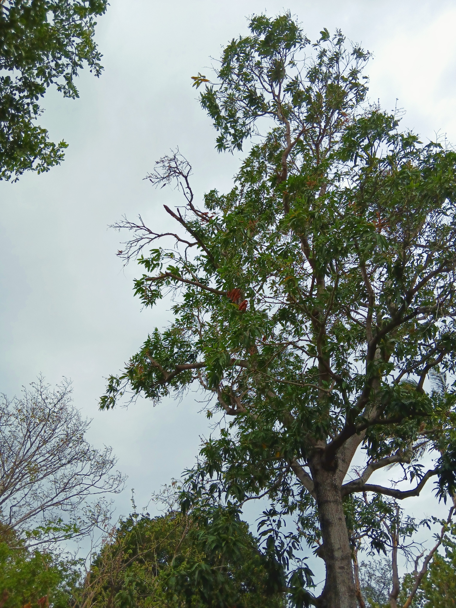 The image is a low-angle shot of trees and the sky, taken from a position looking upwards. The sky is overcast, with a uniform gray color. In the upper portion of the frame, a large tree with thick br…read more