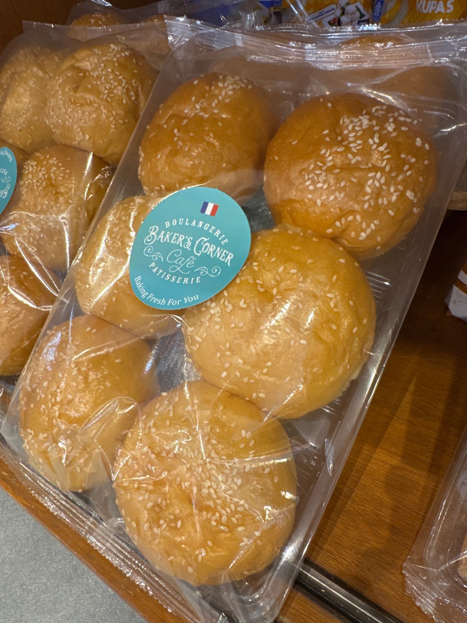 A package of sesame seed buns from Boulangerie Baker's Corner Cafe Patisserie are in a clear plastic package. The label shows the french flag and says, "Baking Fresh for You." The package is on a wood…read more