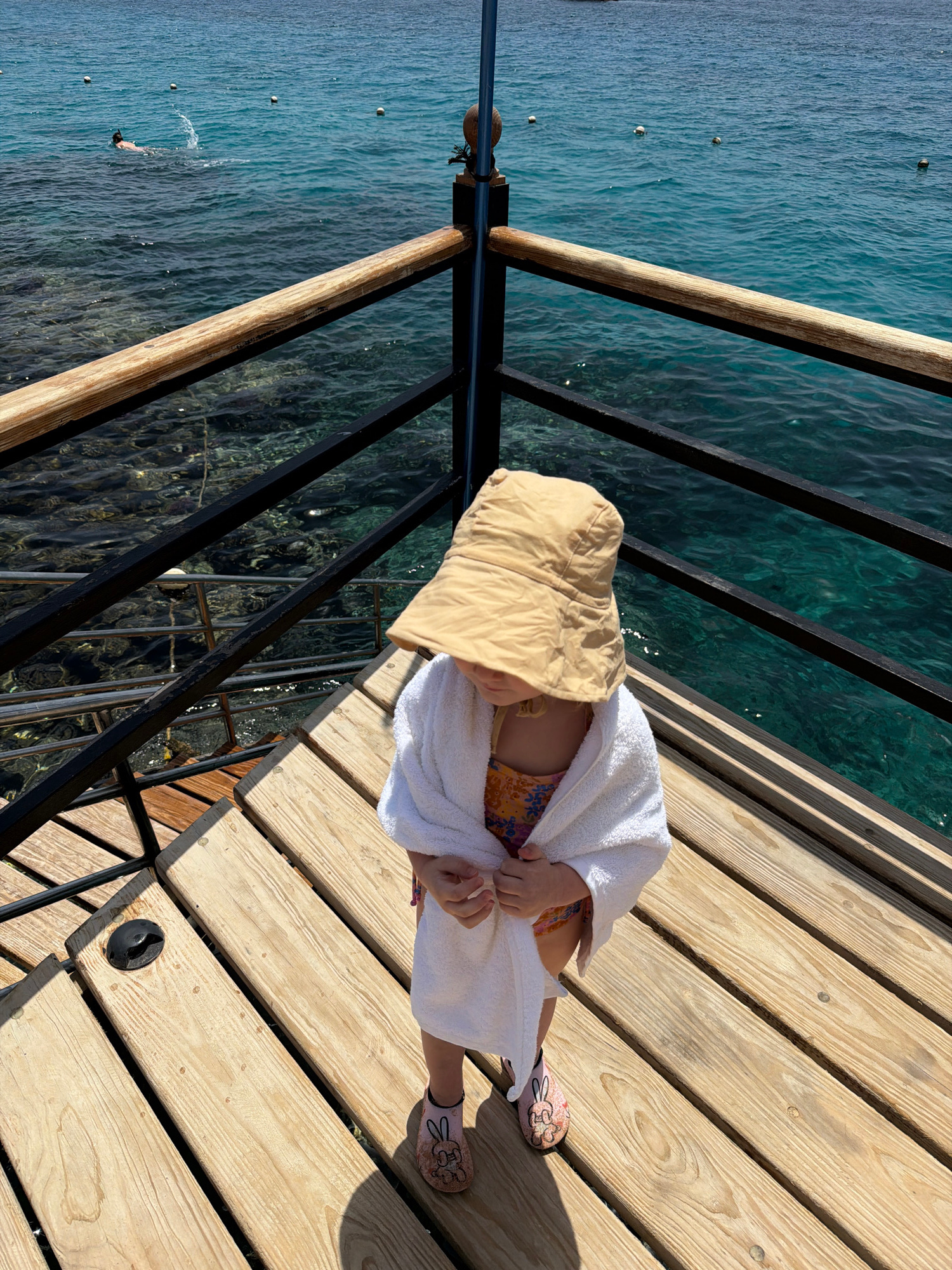 A high-angle shot shows a child wearing a tan hat and white towel, sitting on a wooden dock in Sharm El Sheikh, Egypt. The child is wearing a bathing suit and pink shoes with a cartoon design. The doc…read more