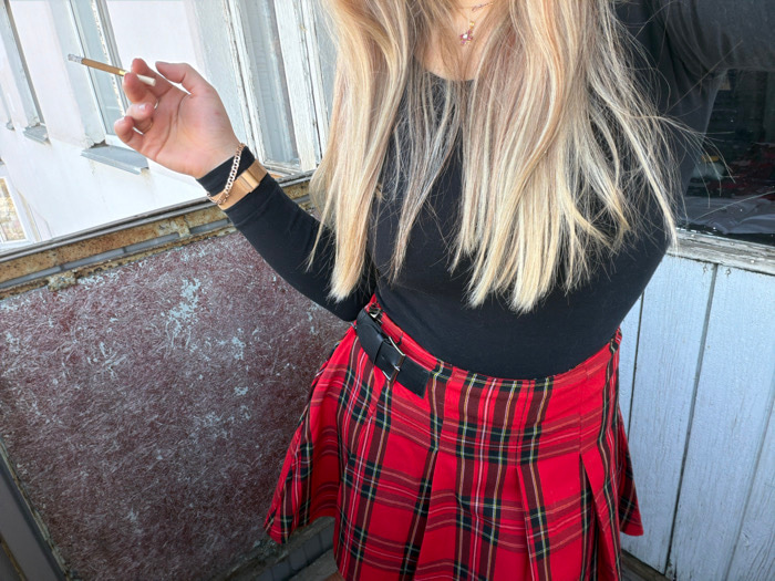 The image displays a partial view of an individual, likely female, positioned on a balcony or at a window in Naberezhnye Chelny, Russia. The subject has long blonde hair and is attired in a black long…read more