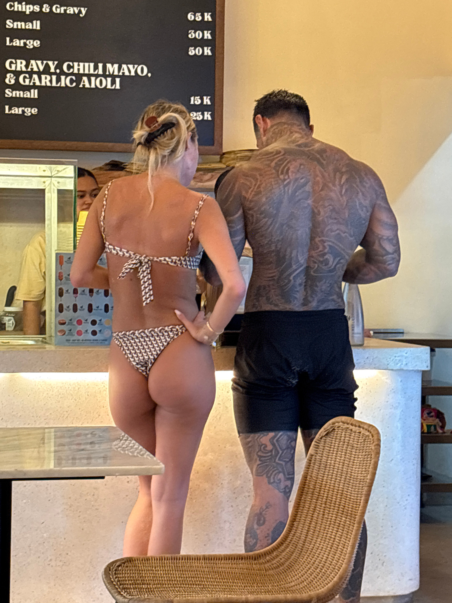 This image, captured in Kuta Selatan, Indonesia, shows two individuals at what appears to be a counter in a casual dining or bar setting. The photo is rotated 90 degrees clockwise, depicting the scene…read more