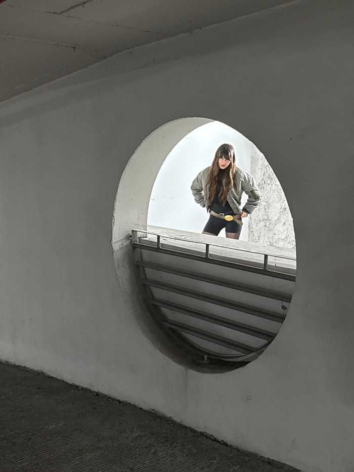 The image depicts a female subject positioned within a circular architectural opening, viewed from an interior concrete space in Tel-Aviv, Israel. The exact location within the city is not visually id…read more