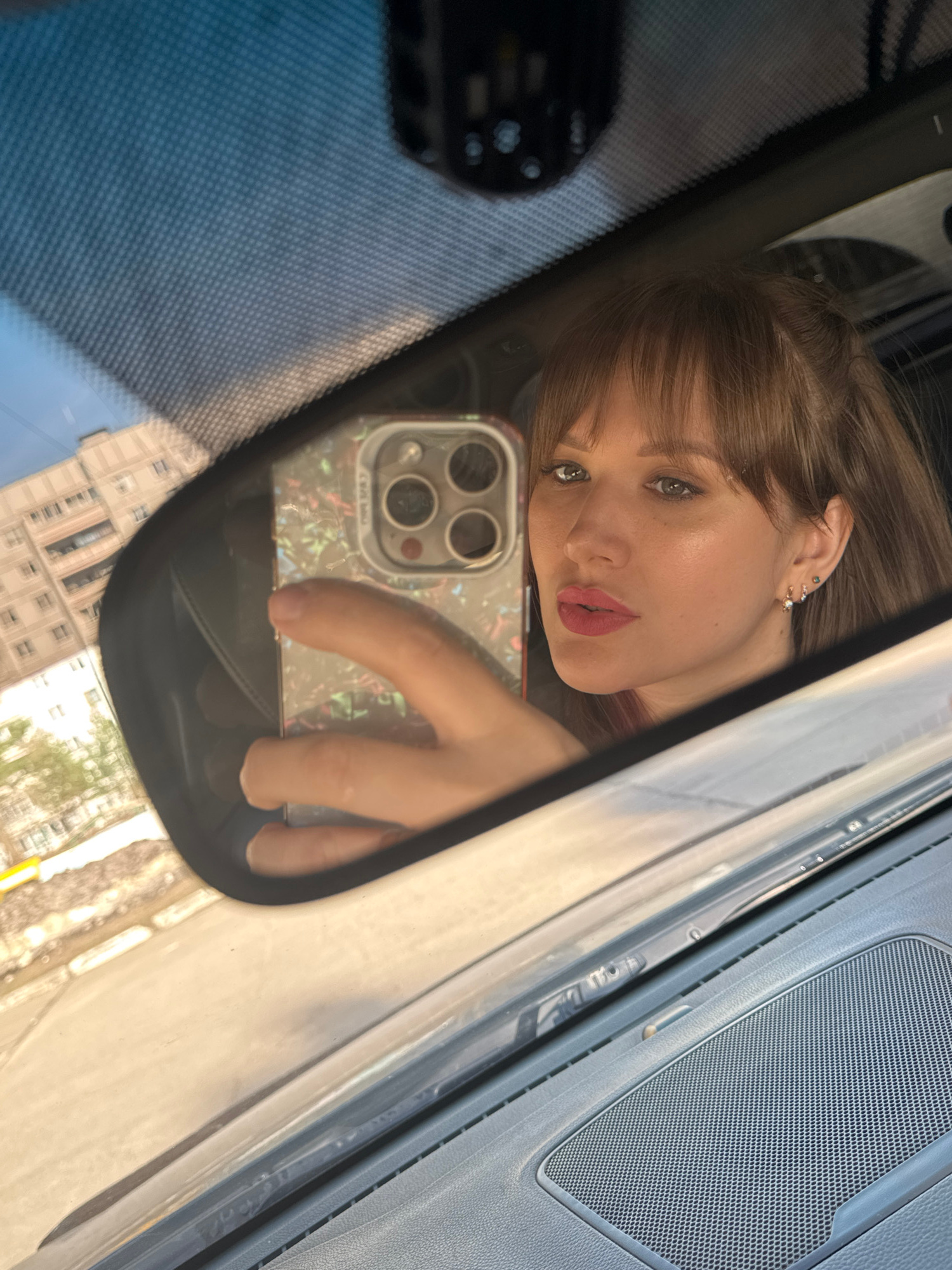 A young woman is captured in a selfie reflected in a car's rearview mirror. She has light brown hair with bangs, light makeup including eyeliner and pink lipstick, and multiple small earrings in her l…read more