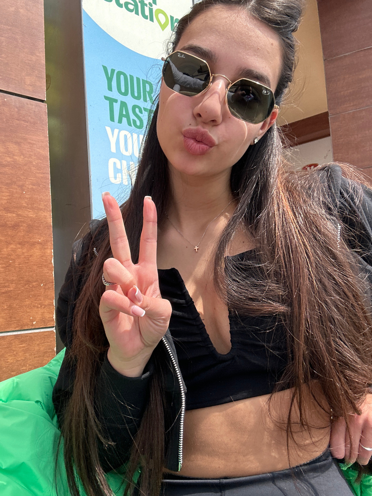 A woman is posing for a photo, wearing sunglasses and making a peace sign. She is wearing a black top and a necklace with a cross pendant. She is sitting near a sign that reads "YOUR TASTE YOU CH." Th…read more