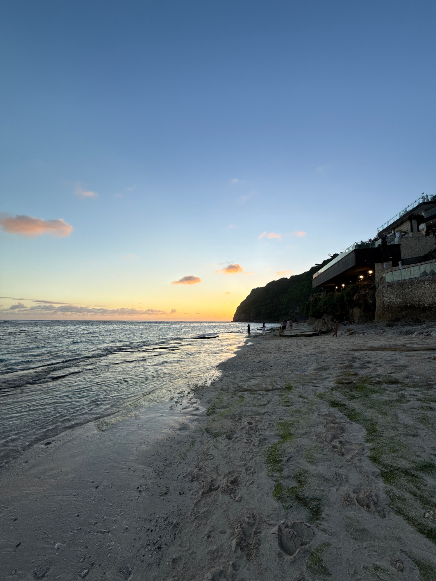 The image shows a view of a beach at sunset in Ungasan, Indonesia. The sky transitions from blue to orange near the horizon, with scattered clouds. A cliff covered in greenery and topped with a multi-…read more