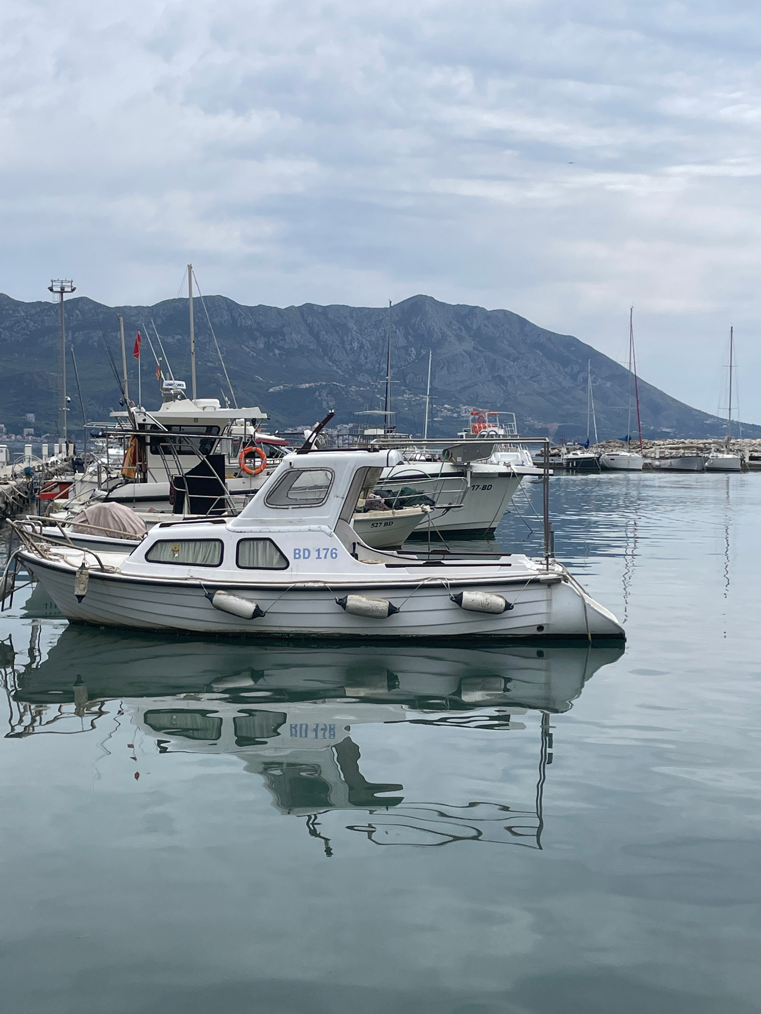 The image shows a marina in Budva, Montenegro, with a clear sky and calm water. Several white boats are docked, including one with the identification "BD 176" clearly visible on its side. The boats ar…read more