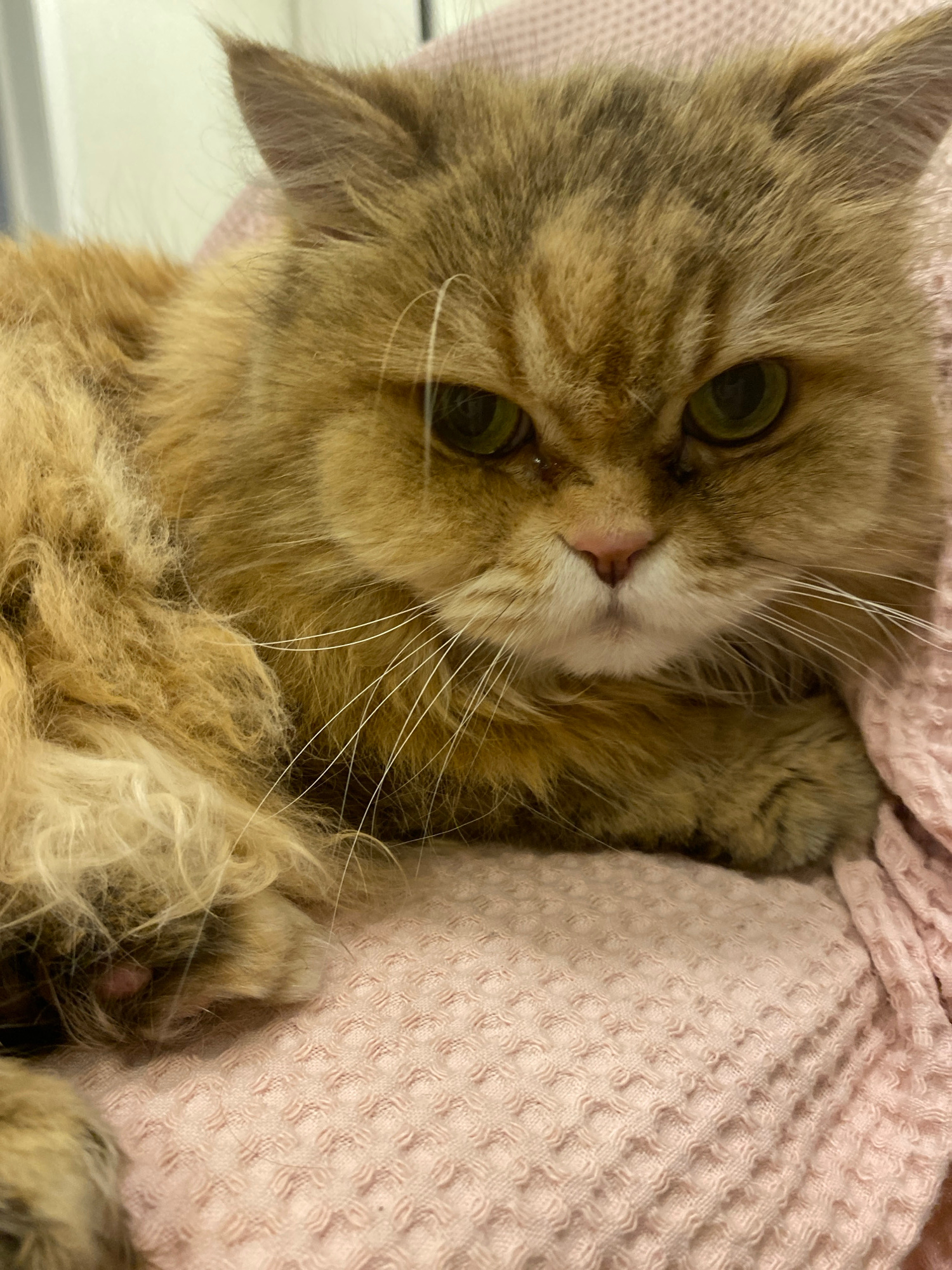 A tan-and-brown long-haired cat with green eyes rests under a light pink textured blanket. The location is indeterminate; there is no discernible information to suggest the city of Kazan, Russia.