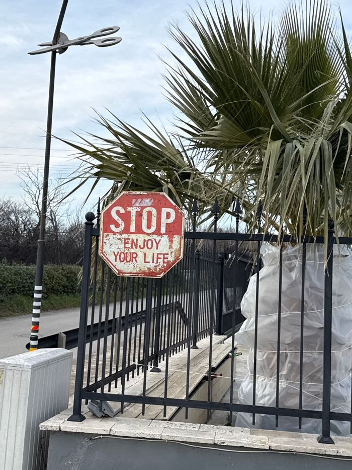 This image depicts an outdoor scene in the city of Sozopol, Bulgaria. The primary subject is a weathered, octagonal stop sign with a red background and white border. The word "STOP" is in large white…read more