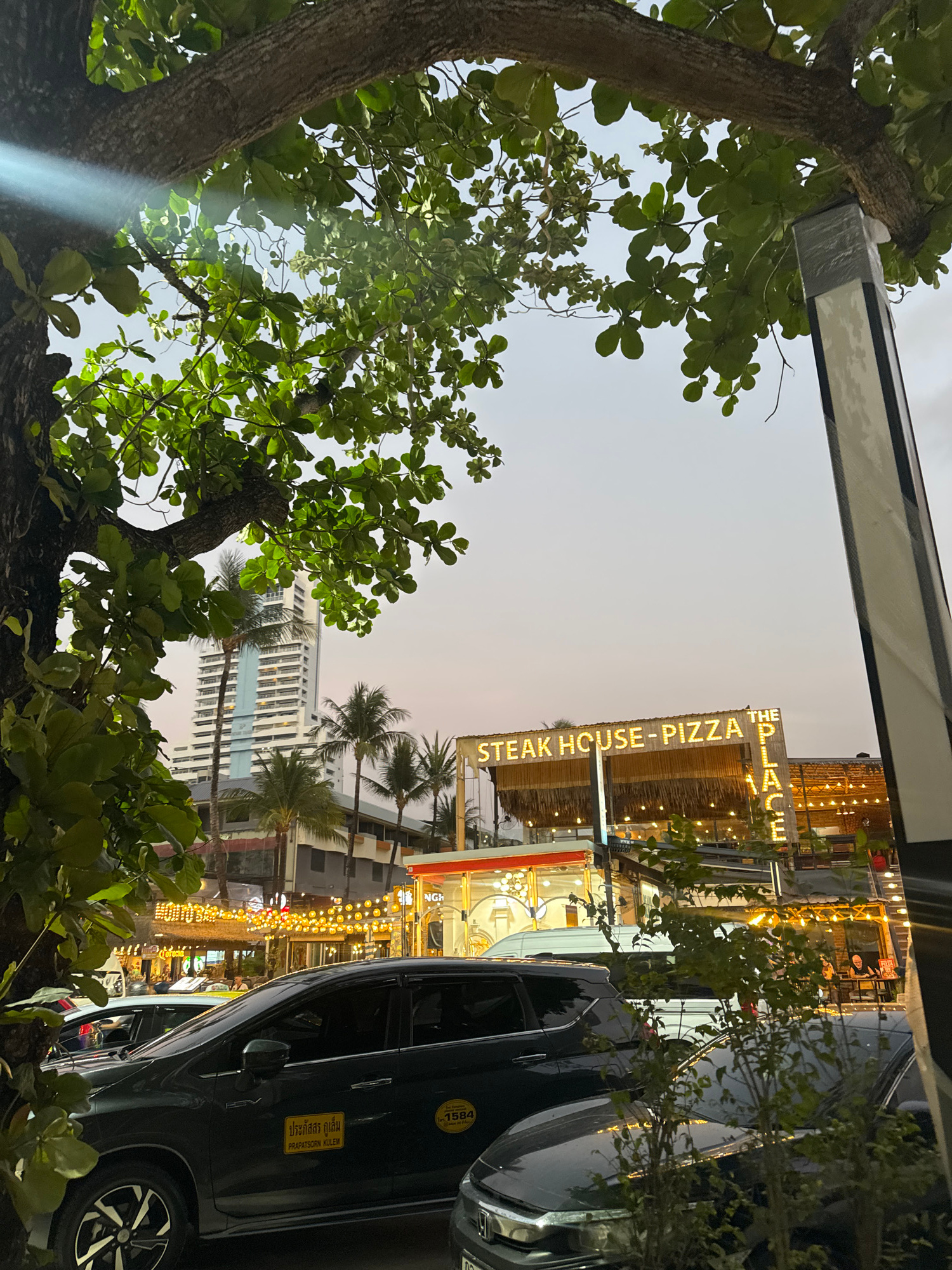 The image, taken at dusk in Patong, Thailand, features a street view framed by a tree in the foreground. A sign reads "STEAK HOUSE-PIZZA THE PLACE". Palm trees are visible beyond the restaurant. A mod…read more
