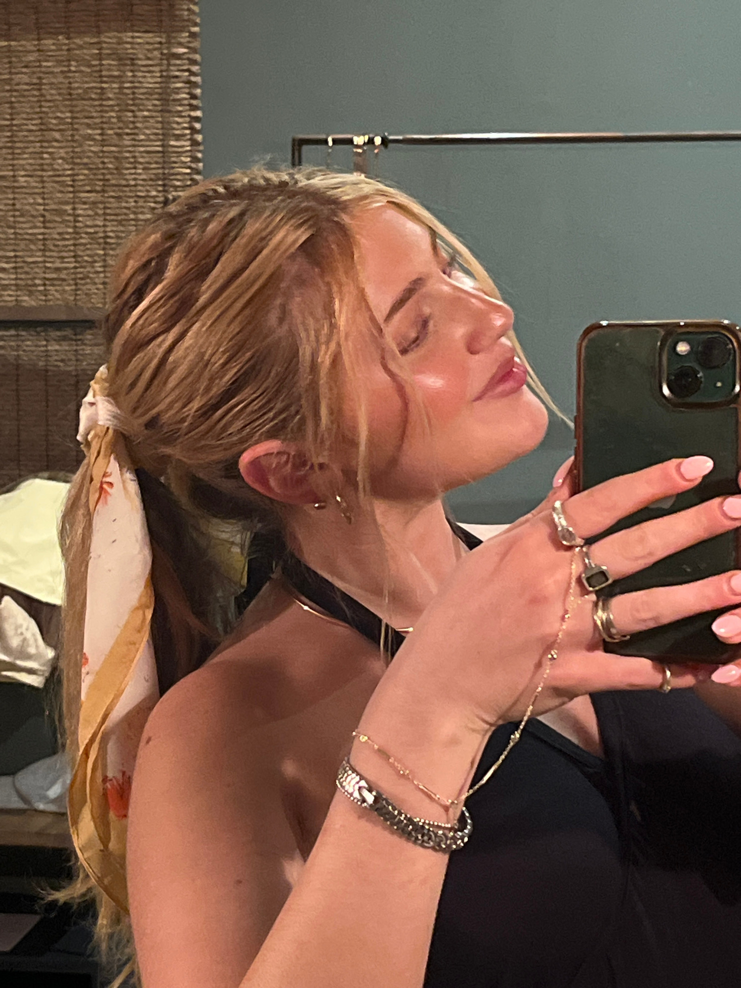 A selfie taken in an indoor environment. A woman with blonde hair and fair skin holds a phone, her hand adorned with multiple rings and bracelets. She wears a black top and a patterned scarf is tied i…read more