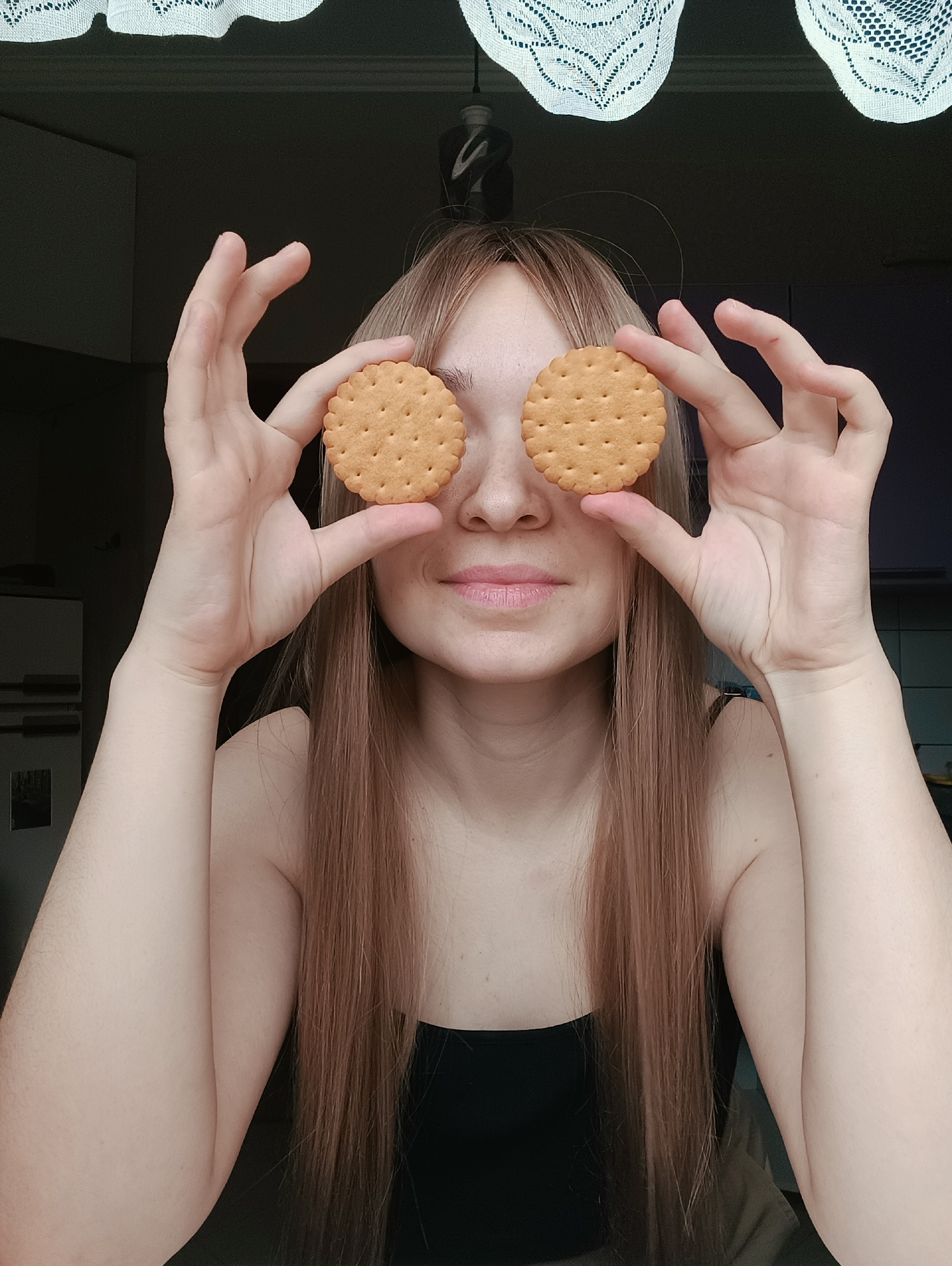 A young woman is centered in the frame, holding two round, light brown cookies over her eyes. She is looking directly at the camera and smiling slightly. Her long, light brown hair is parted in the mi…read more