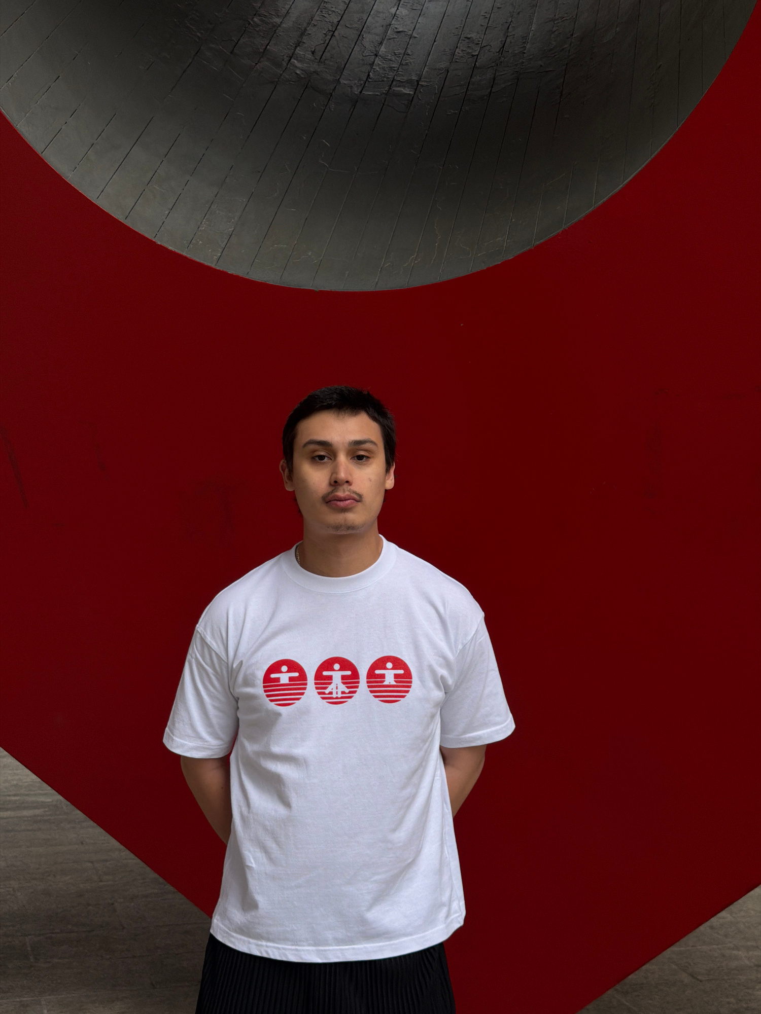 A young man stands against a backdrop of geometric shapes. He is facing the camera, his hands behind his back. The man is wearing a white t-shirt with three red circular logos. The background is compo…read more
