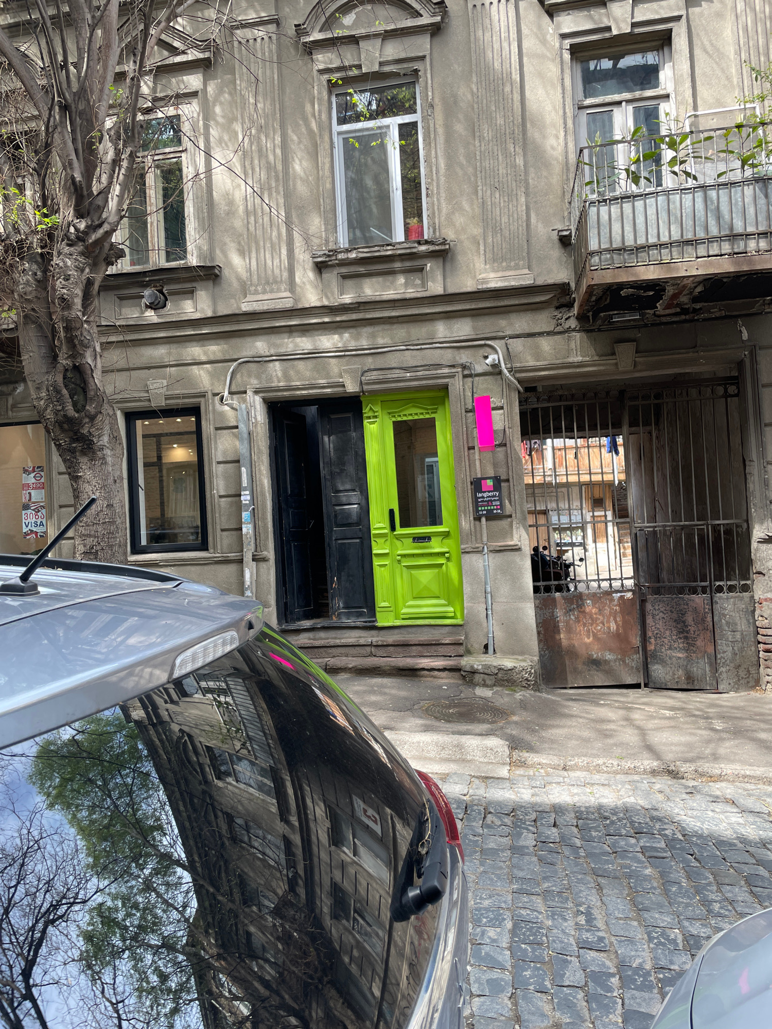 The image depicts the façade of a weathered building in Tbilisi, Georgia. The building has a gray, textured exterior and features a bright green door at the entrance. Above the entrance is a doorway p…read more