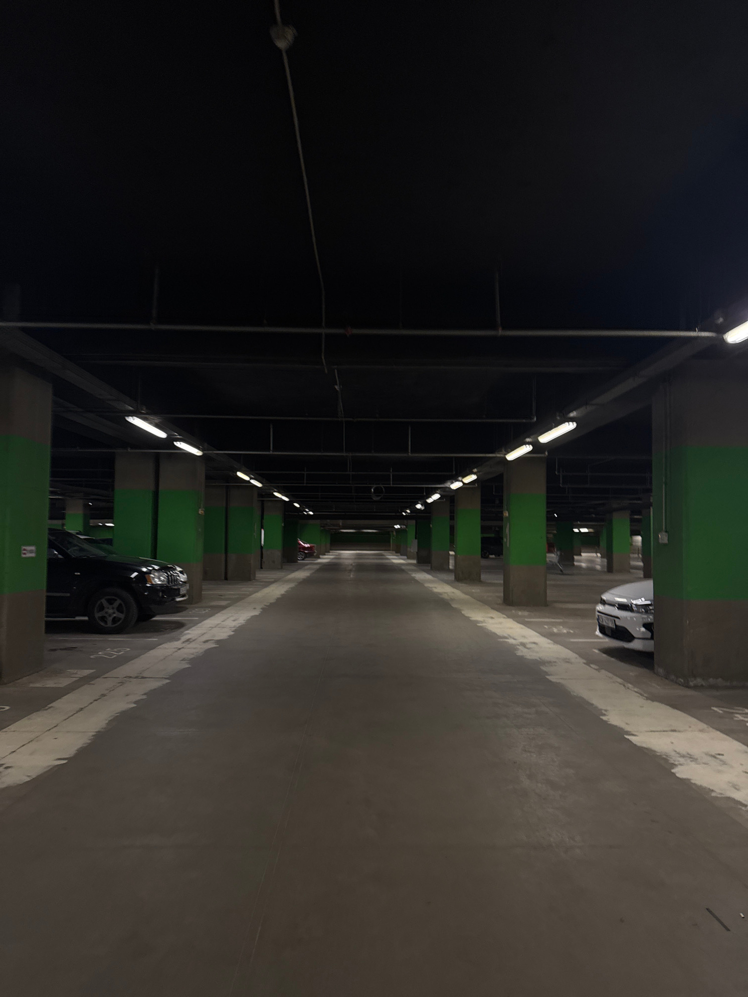 The image shows the interior of a parking garage. The walls are grey and marked with white lines indicating parking spaces. A black car is parked on the right side of the frame, partially visible. Inβ¦read more
