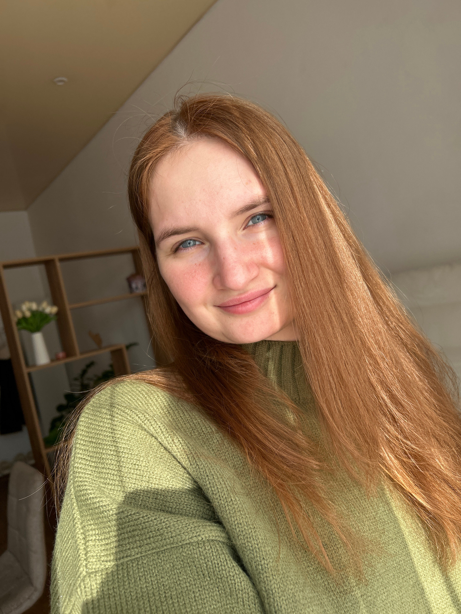 A young woman with long, reddish-brown hair and blue eyes is smiling. She is wearing a light green sweater. Behind her is a light-colored wall and a shelving unit with a vase of white flowers on one o…read more