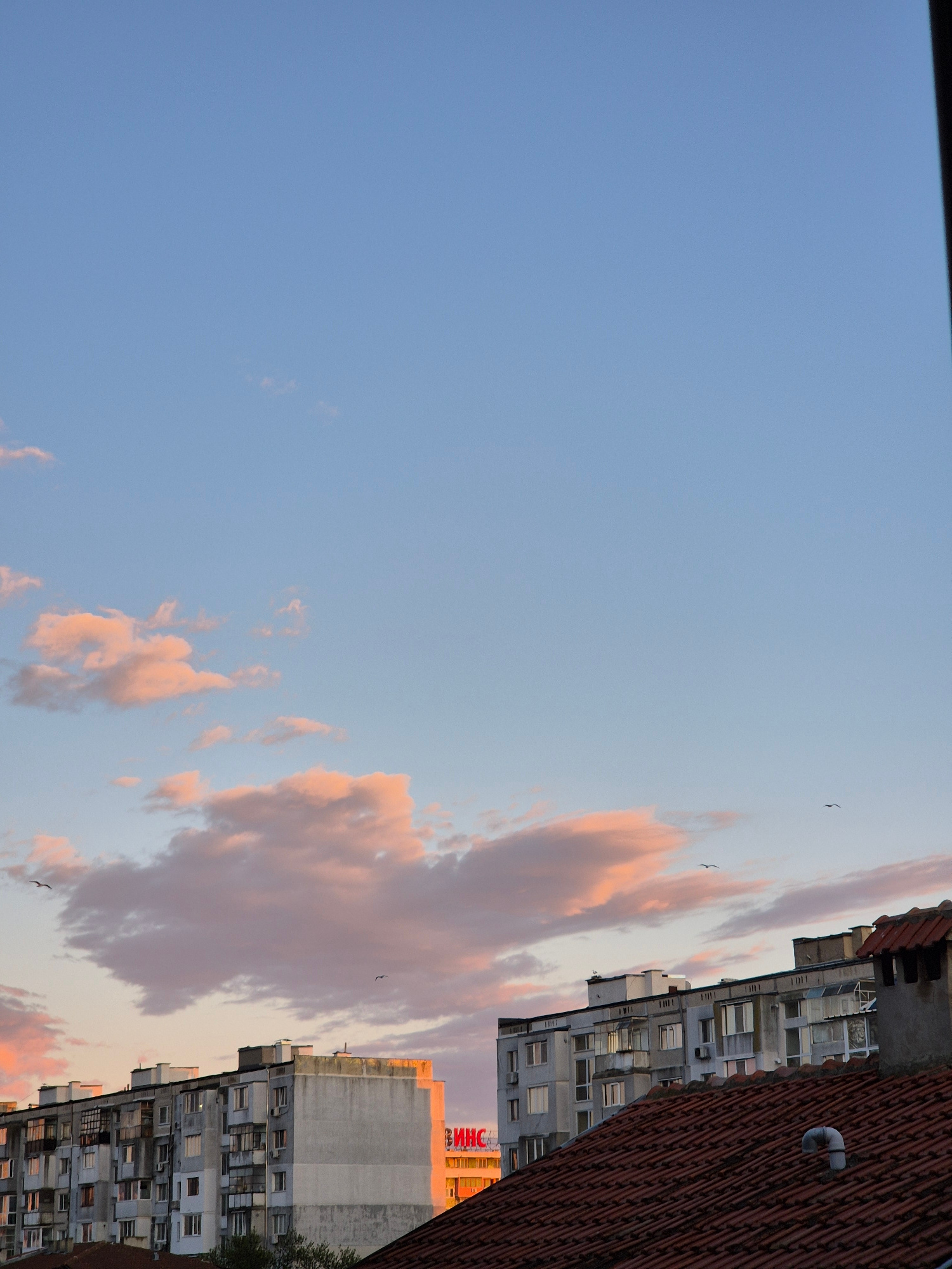 The image shows an upward view in an urban setting, with residential buildings dominating the right side. The buildings are multi-storied and appear to be older apartment complexes. The facade of the…read more