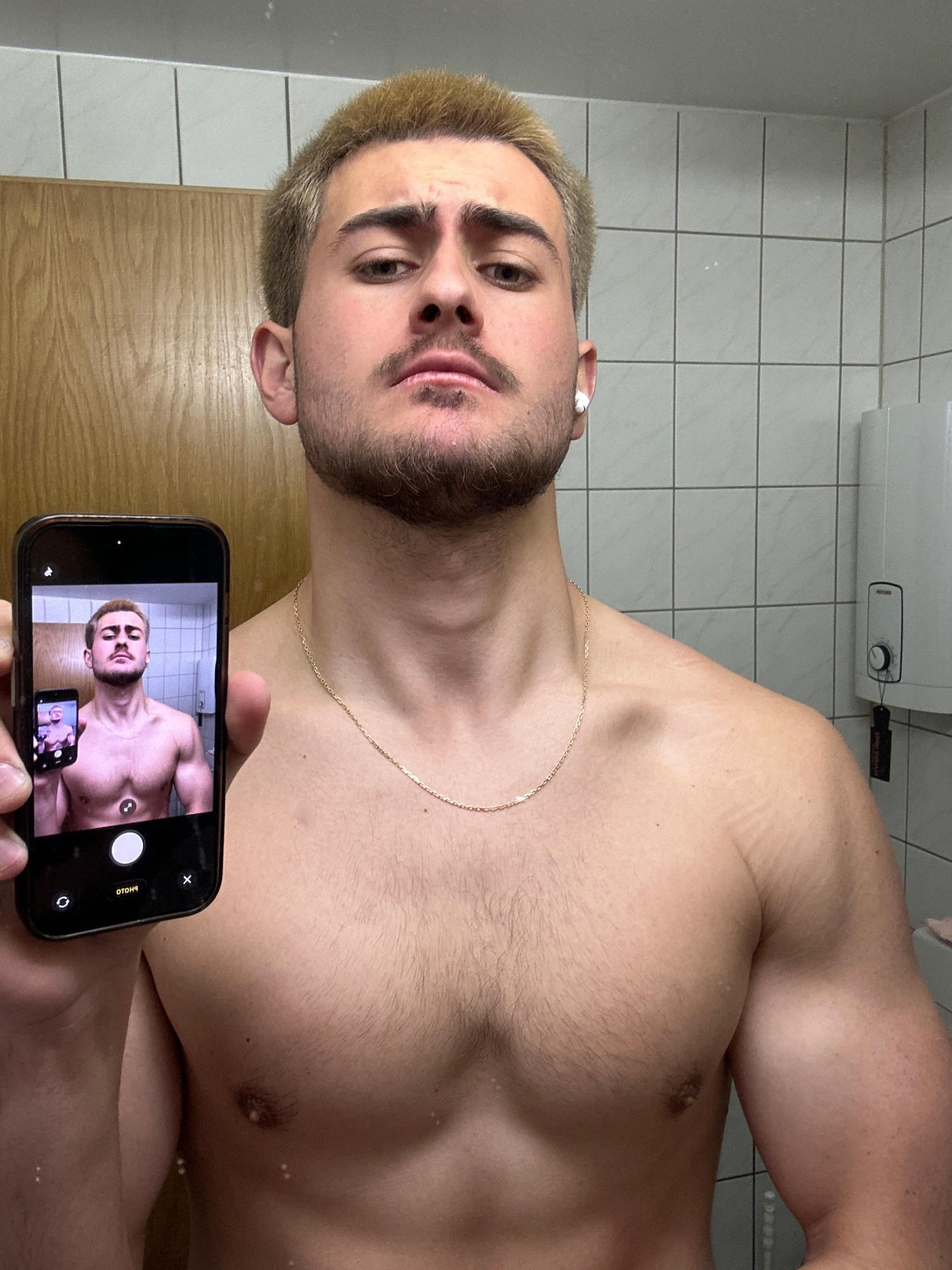 The image shows a shirtless man with fair skin, a dark beard, and bleached blonde hair, taking a photo of himself in a bathroom with his smartphone. He is wearing a gold chain and has a white earbud i…read more
