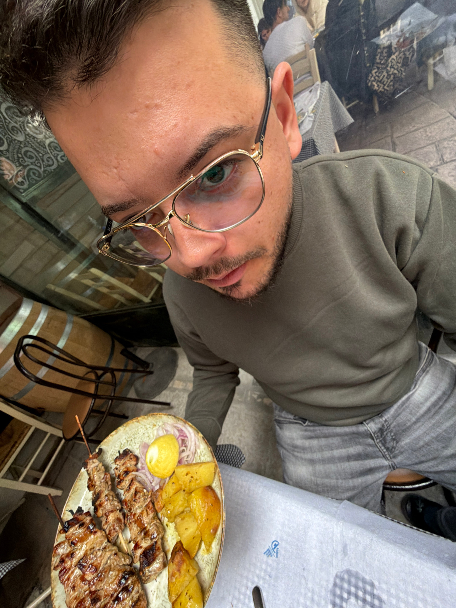 A man is taking a selfie at an outdoor table in what is likely a restaurant or taverna in Serres, Greece. He is wearing a green sweatshirt, grey jeans, and gold-rimmed glasses. On the table is a plate…read more