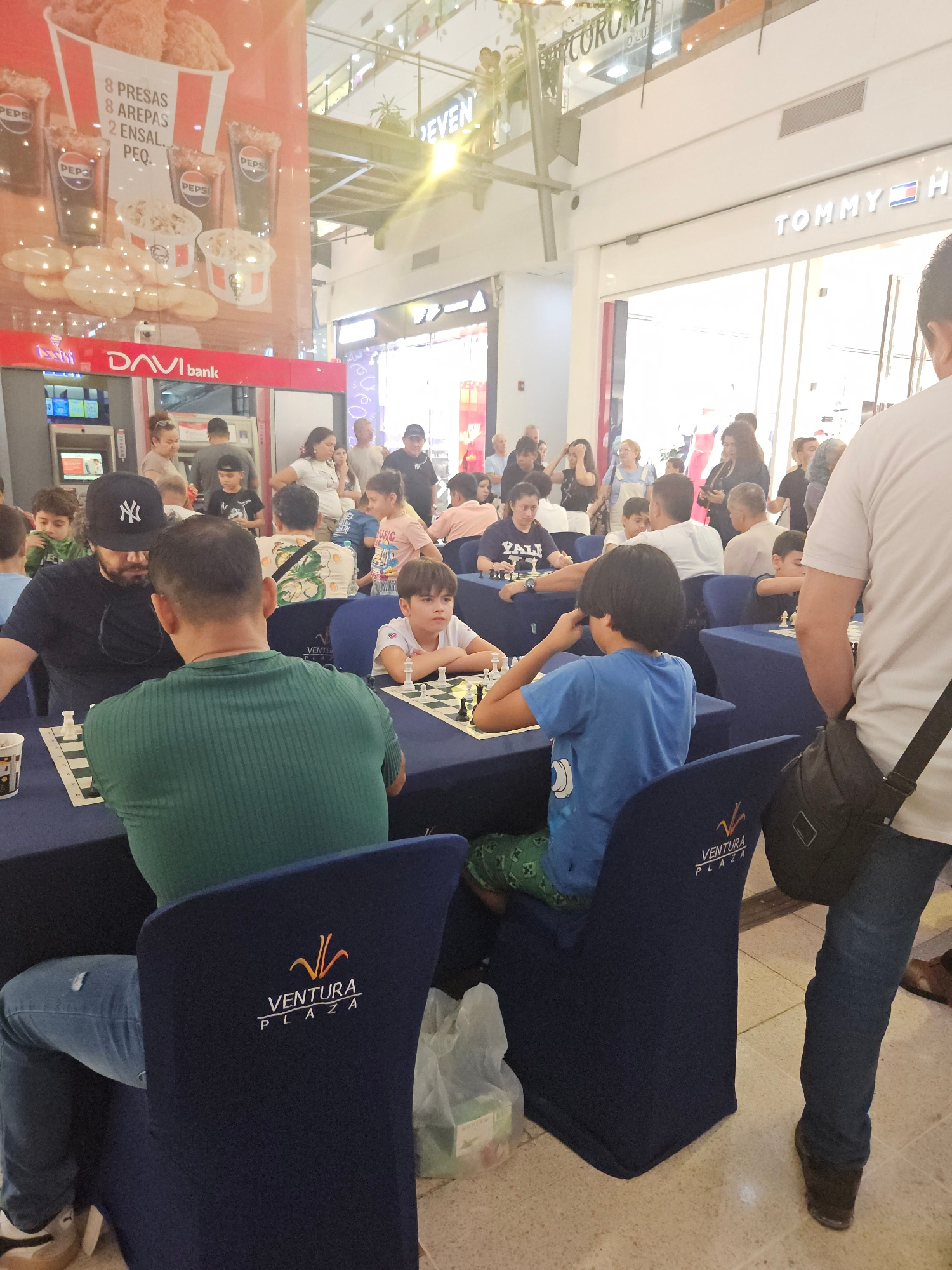 Here is a detailed description of the image: **Scene:** The image captures a crowded event in what appears to be a shopping mall, likely a chess tournament or competition. The event is branded with "…read more