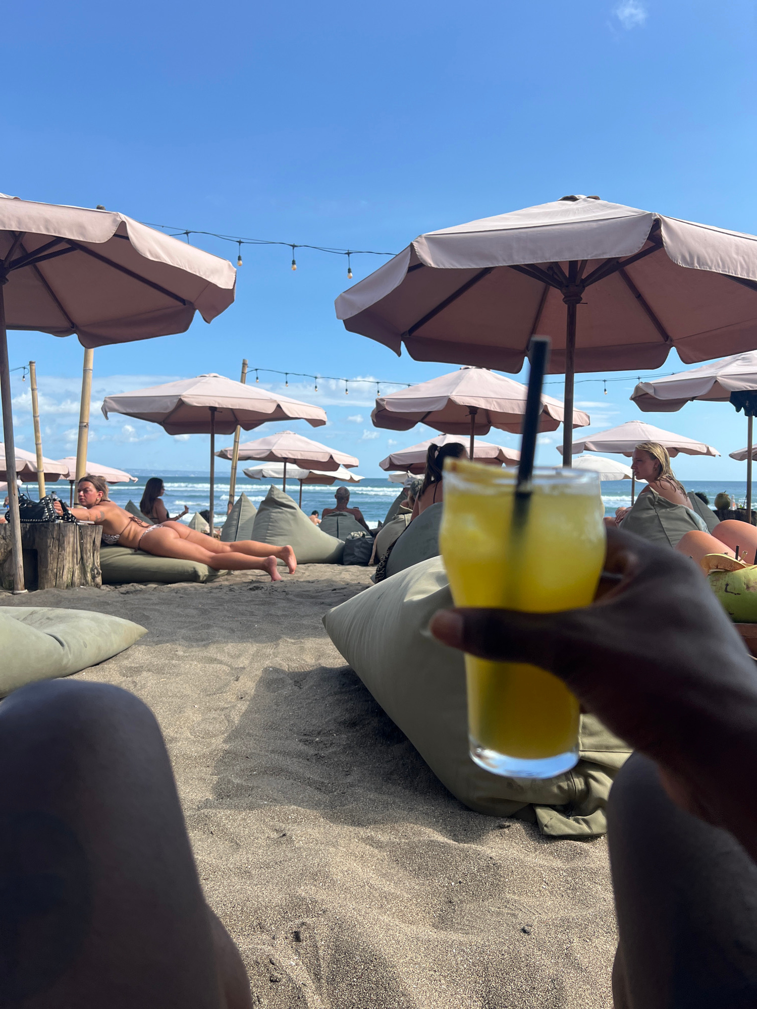 The image captures a beach scene, likely in North Kuta, Indonesia. A person holds a glass of yellow liquid with a black straw in the foreground. In the background, there are several beach umbrellas, a…read more