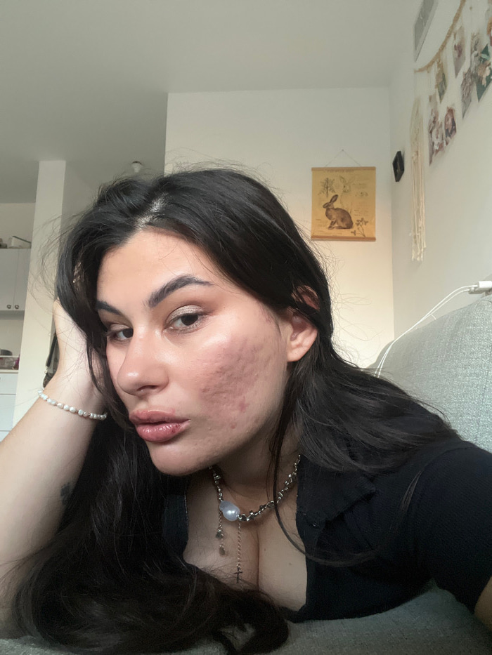 The image captures a female individual from the chest up, positioned in a domestic indoor setting within Kiryat Bialik, Israel. She is reclining on a light-colored, ribbed upholstered surface, likelyβ¦read more